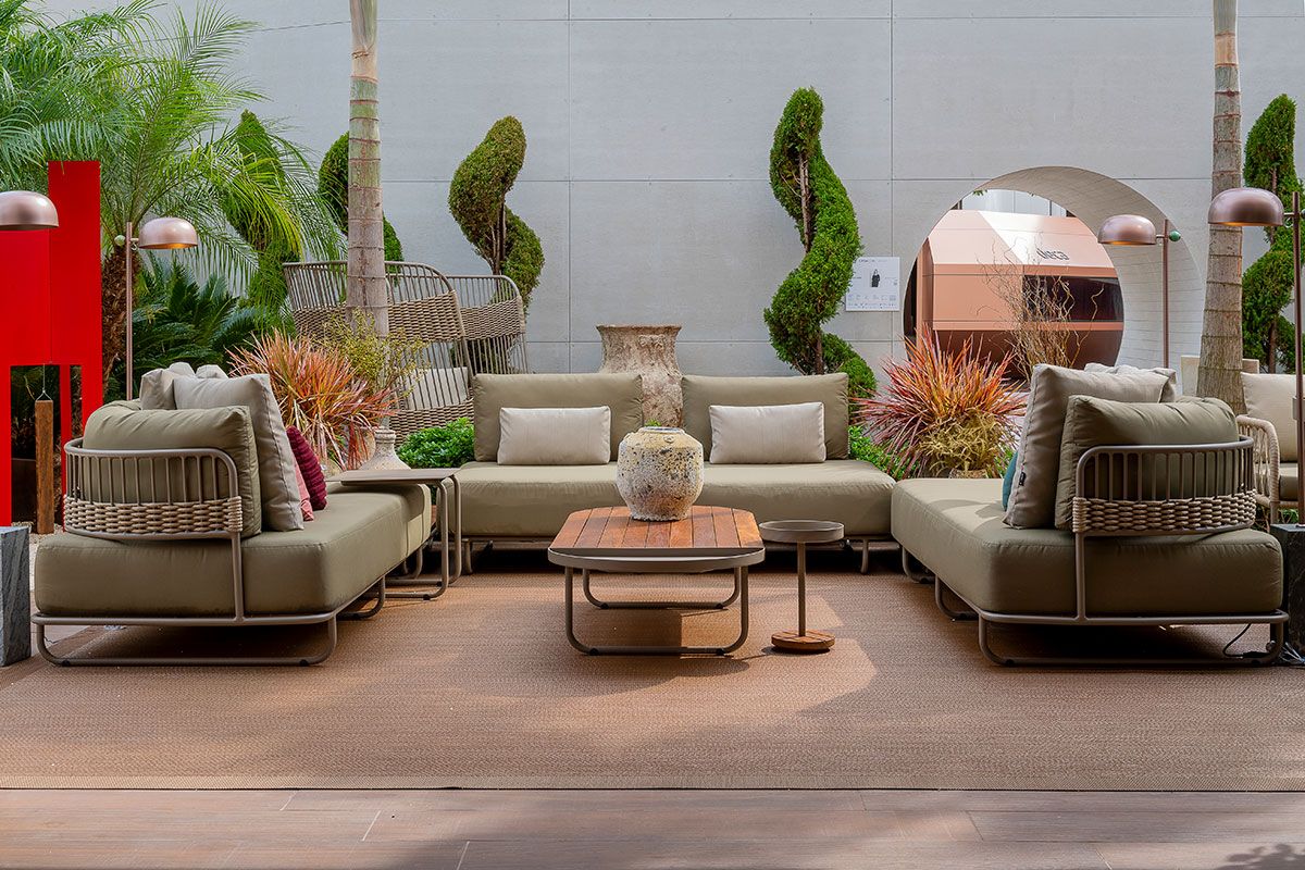 O destaque do ambiente é a lareira e o balcão em Sensa Taj Mahal, da Cosentino, que é uma superfície de granito natural que possui uma proteção resistente às manchas e que a torna única. Outro ponto alto do cenário, é o jardim, elaborado em conjunto com a paisagista Mônica Costa, que resgata o uso das espécies topiadas que contrastam com esculturas em aço carbono do artista Marcio Faria.