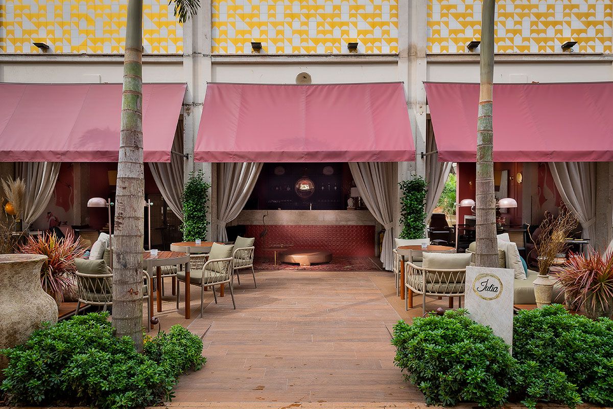 Logo na entrada, a fachada é marcada por grandes painéis de azulejaria criados pelos profissionais. Nas cores off white e ouro, completam a arquitetura original juntamente com três toldos na cor marsala. O terraço é composto por lounges que dão acesso visual à paisagem exterior. O mobiliário com estrutura tubular, corda náutica e madeira, mescla almofadas com estampas de chevron.