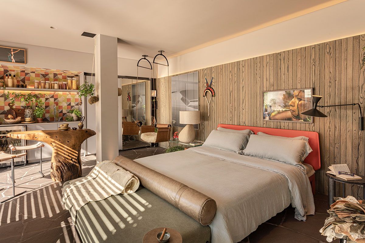 O artista convidado, Antonio Peticov, empresta sua criatividade dando vida aos ladrilhos hidráulicos e à escultura de neon. Já os índios do Xingu, pelo olhar de Renato Soares, são os guardiões do casal enquanto dormem na cama coral
