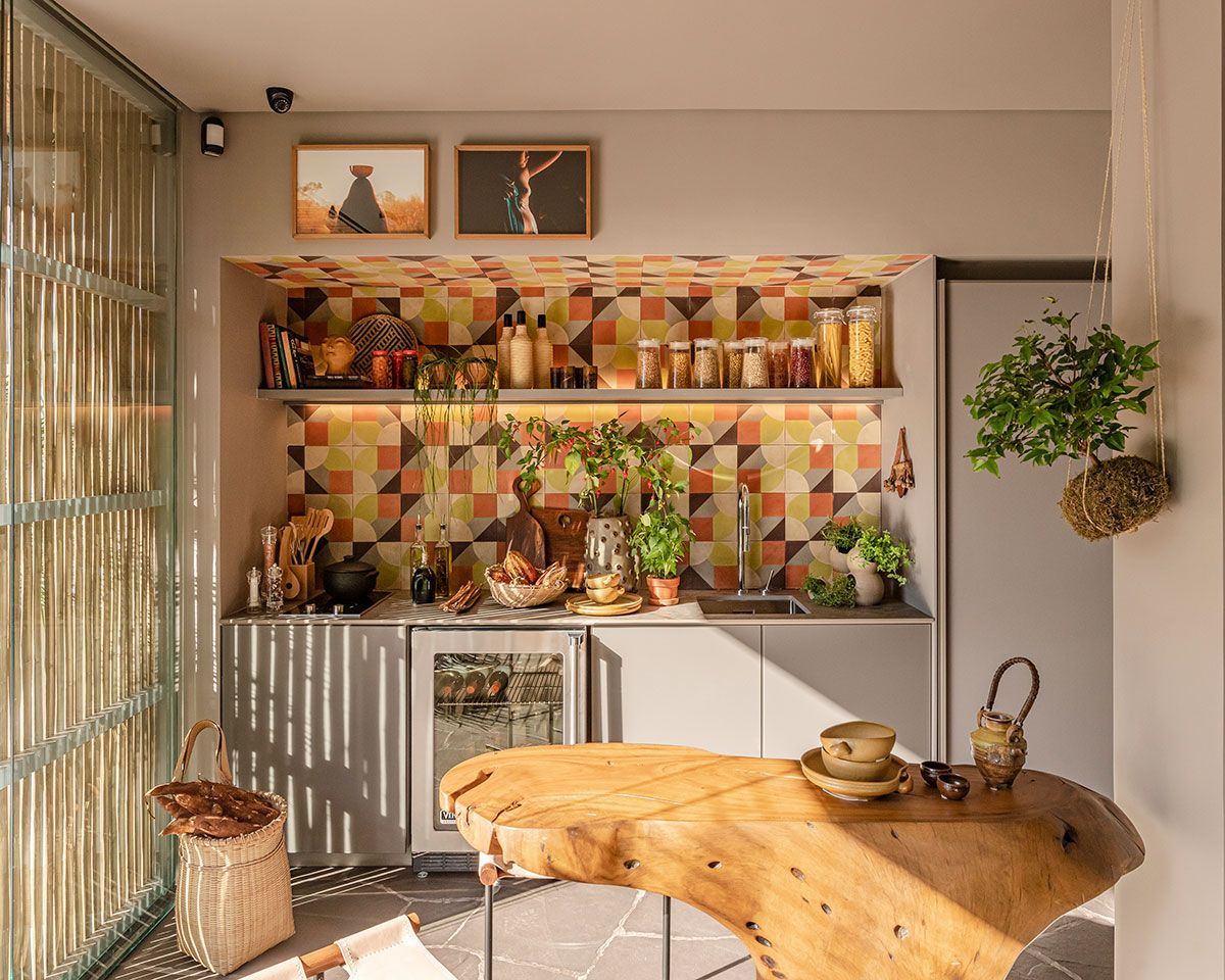 Um dos destaques do ambiente é a bancada em Dekton Kira, da Cosentino, que é inspirado pela pedra natural, assemelha-se a Gris Pulpis devido à sua versatilidade. Kira é uma cor baseada em tons térreos e possui veios contrastantes em cinzento claro.