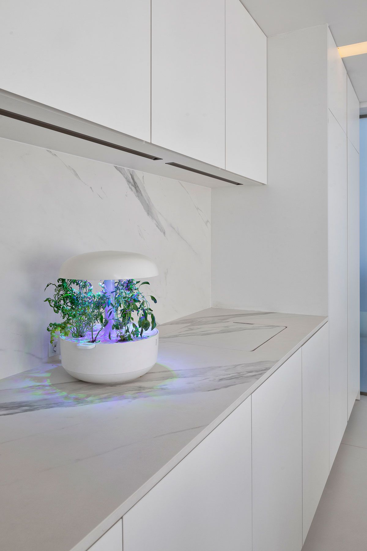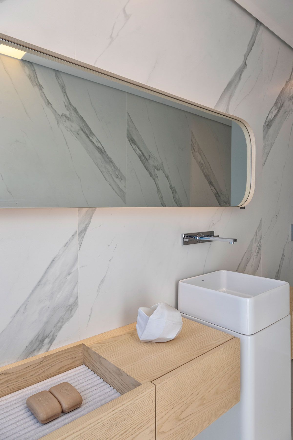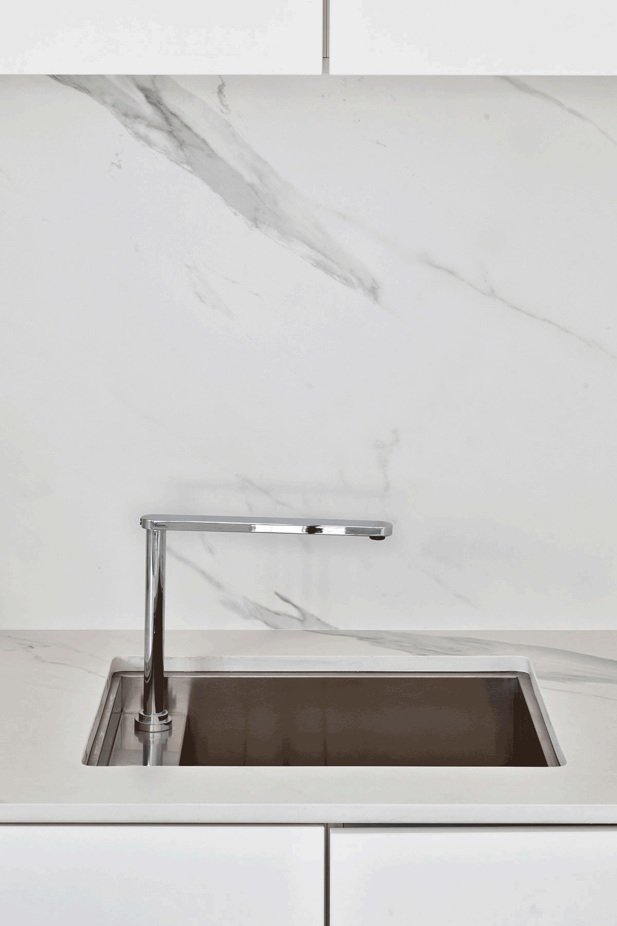 Como destaque, o revestimento das paredes da cozinha e do banheiro, o Dekton Opera, da Cosentino. Este material, que tem a aparência nobre dos mármores, possui tecnologia que permite uma limpeza fácil e pode ser aplicado tanto em áreas internas quanto externas.