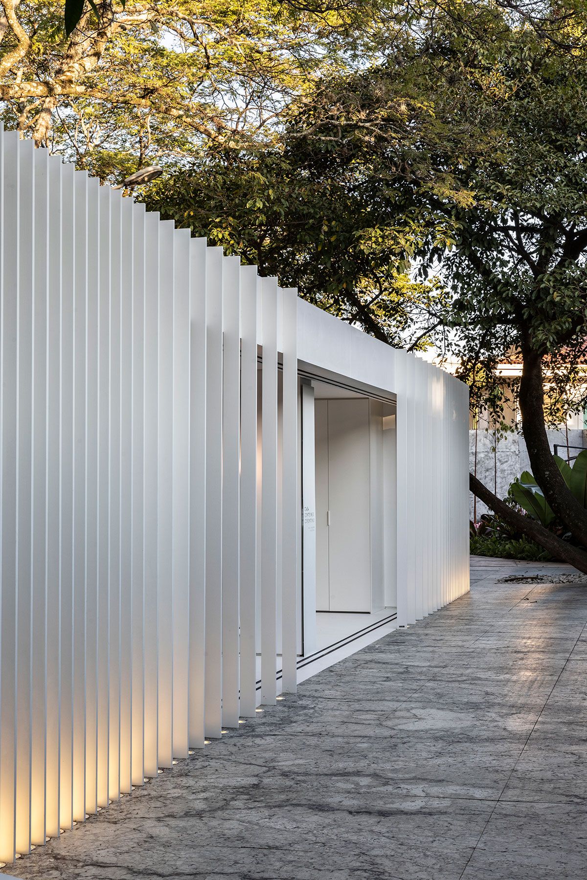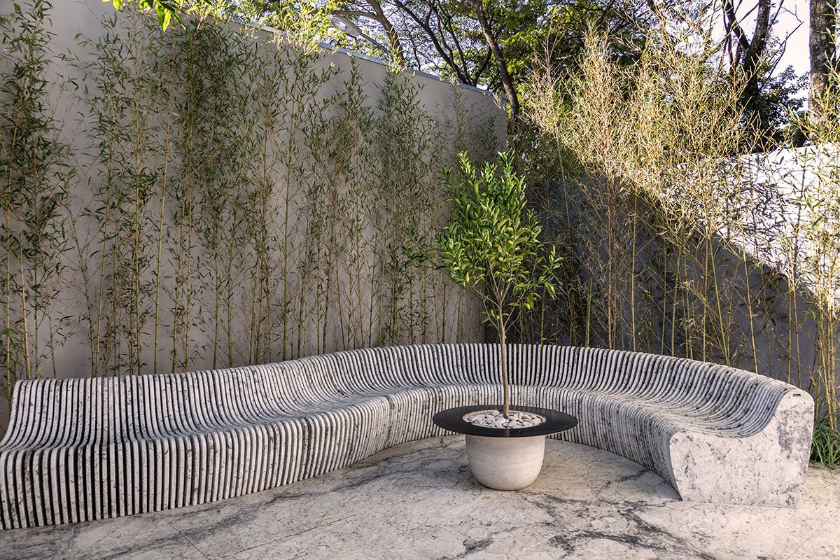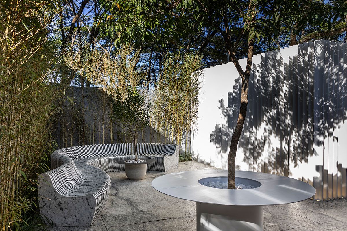 Os revestimentos da Cosentino também estão presentes: na bancada da cozinha, o Dekton Olimpo; Já na fachada, cobertura e piso interno é o Dekton Zenith; Ainda fachada, mas nos brises, o Dekton Ariane; O Silestone Blanco Norte, na bancada do banheiro e o Granite White Lava no piso e mobiliário do terraço.