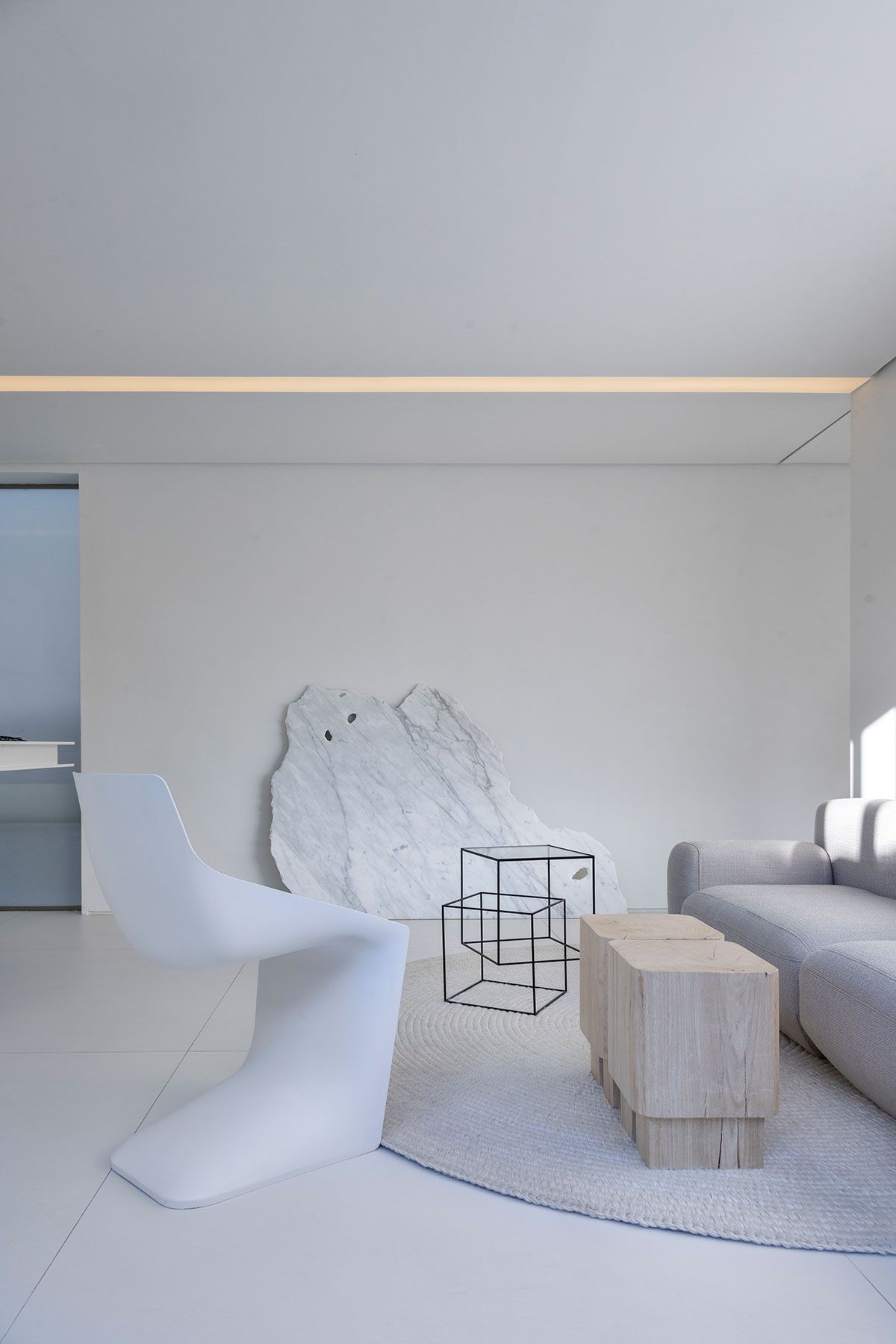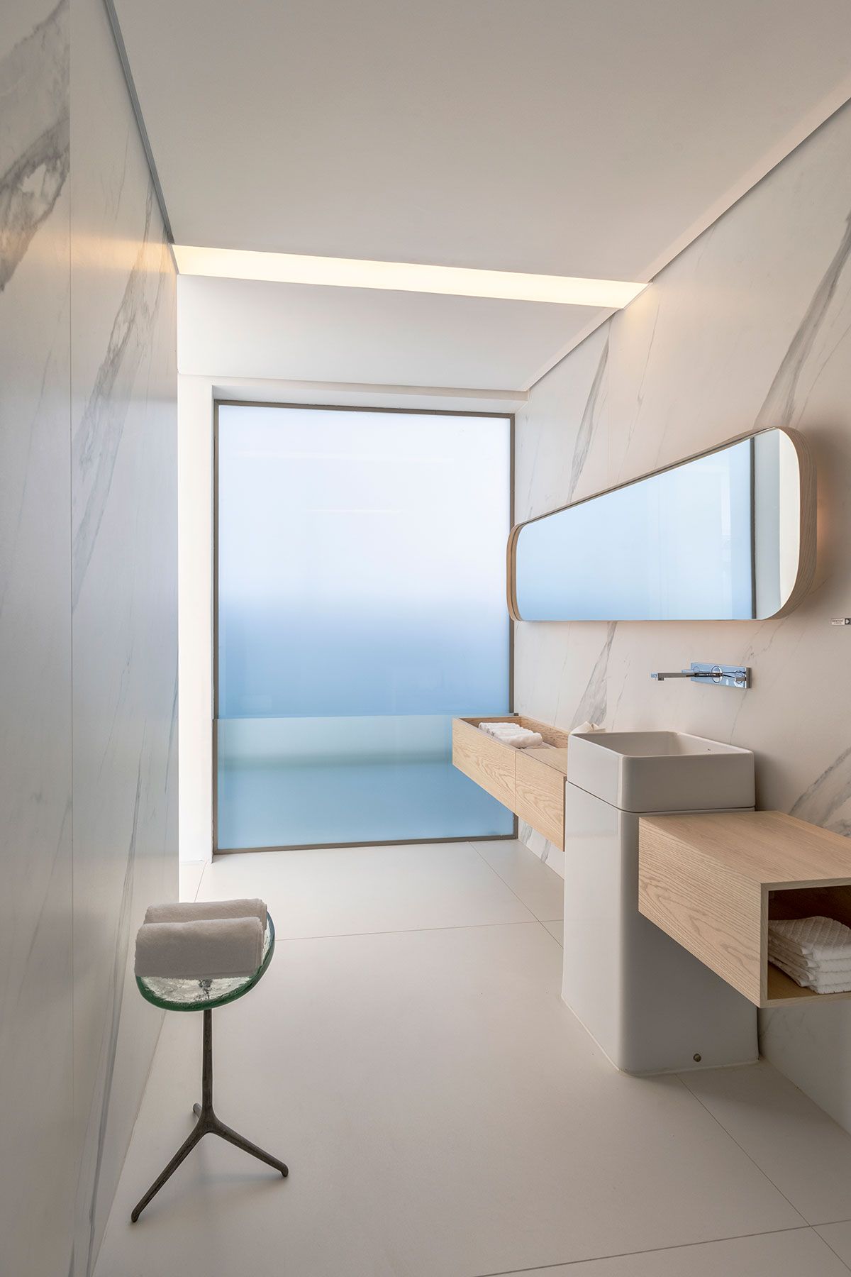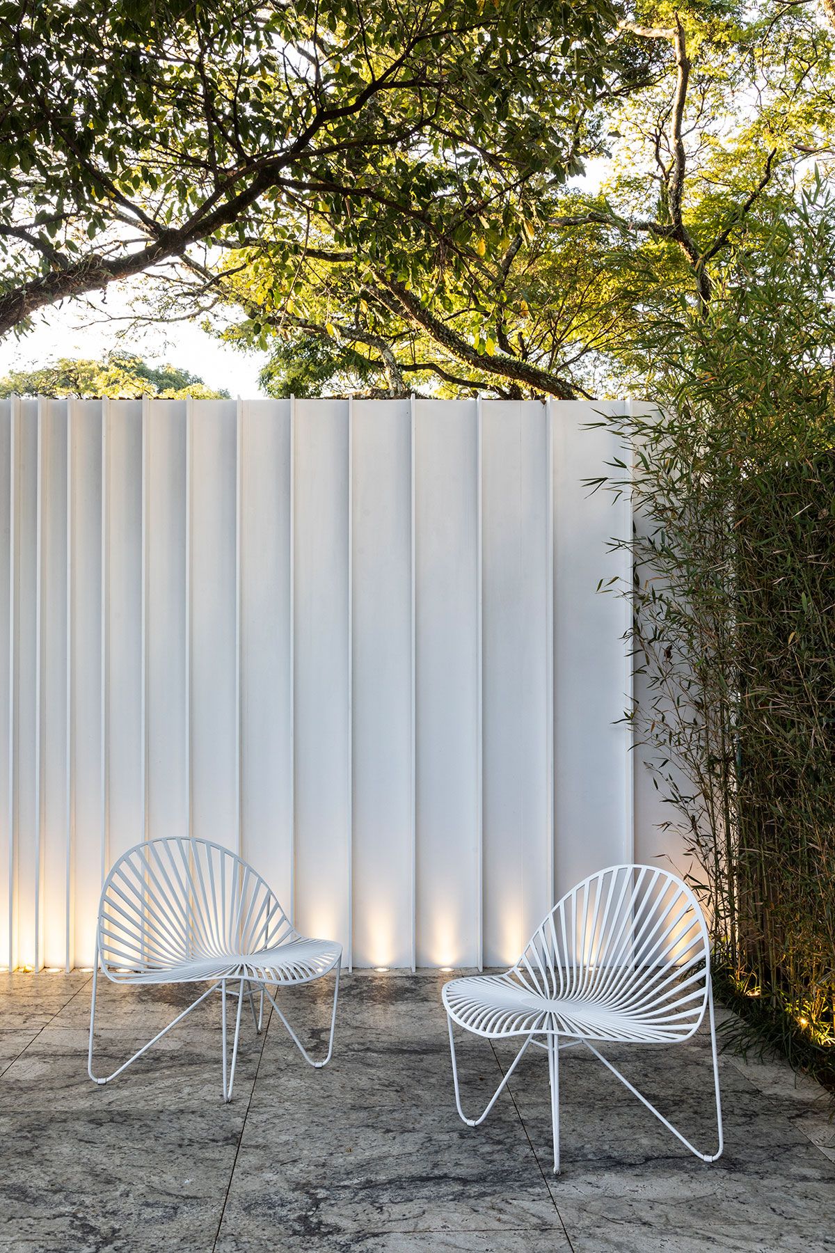 Os revestimentos da Cosentino também estão presentes: na bancada da cozinha, o Dekton Olimpo; Já na fachada, cobertura e piso interno é o Dekton Zenith; Ainda fachada, mas nos brises, o Dekton Ariane; O Silestone Blanco Norte, na bancada do banheiro e o Granite White Lava no piso e mobiliário do terraço.