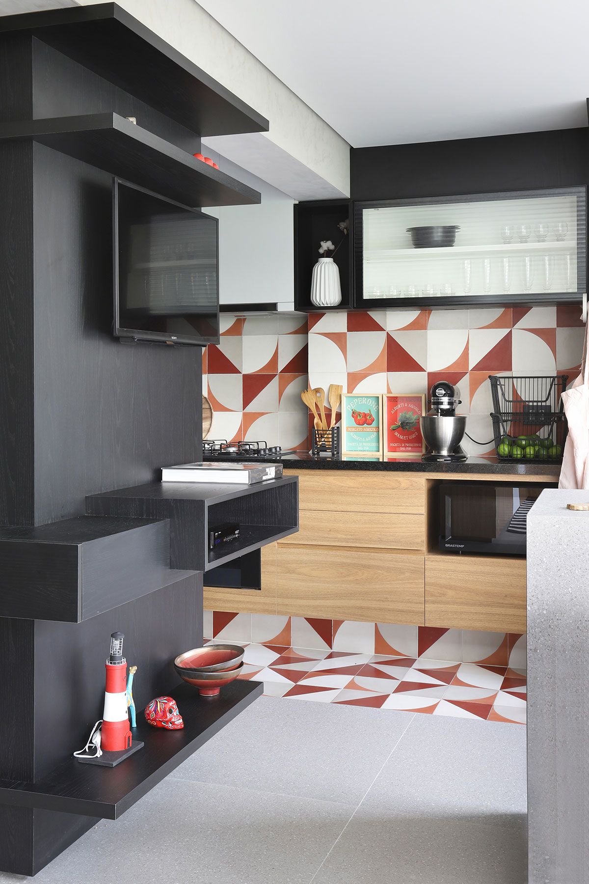 E para a cozinha o revestimento mais charmoso do projeto, o ladrilho hidráulico numa paginação desenvolvida pelo escritório que mescla desenhos geométricos em tons de vermelho e branco formando uma faixa na frente da bancada da cozinha se estendendo até a churrasqueira e se repetindo na parede acima da bancada.