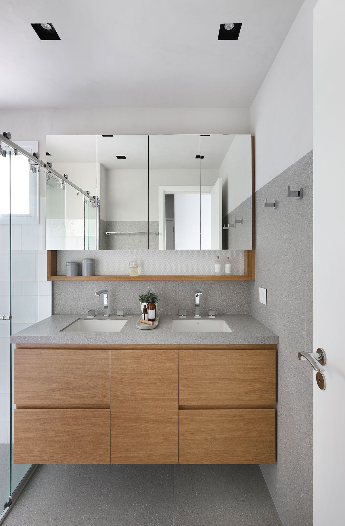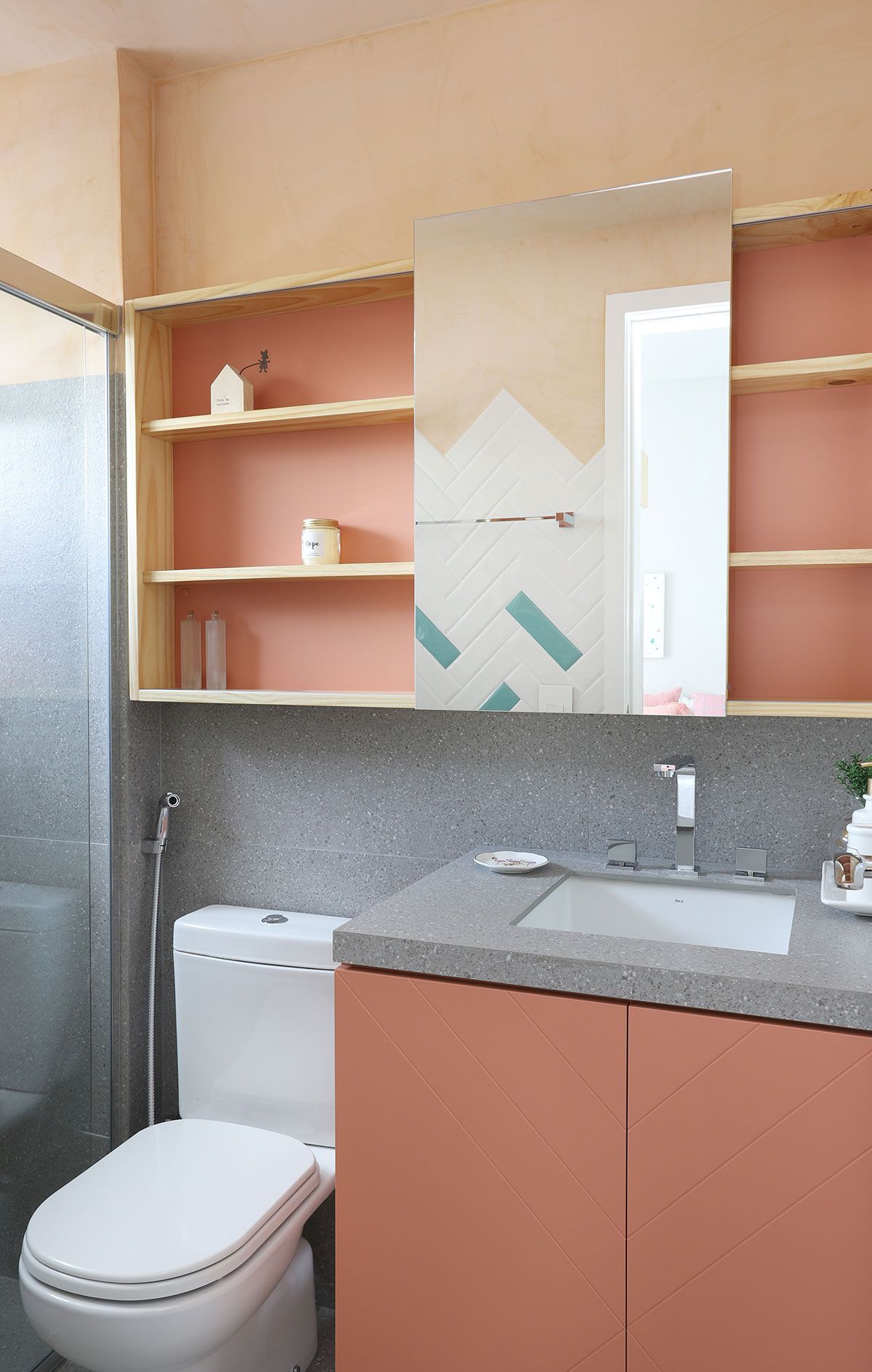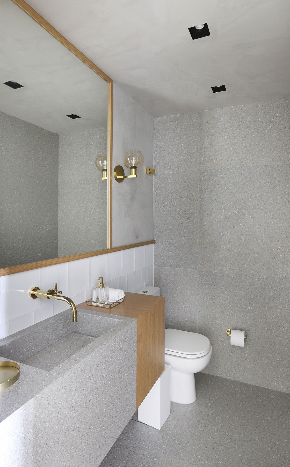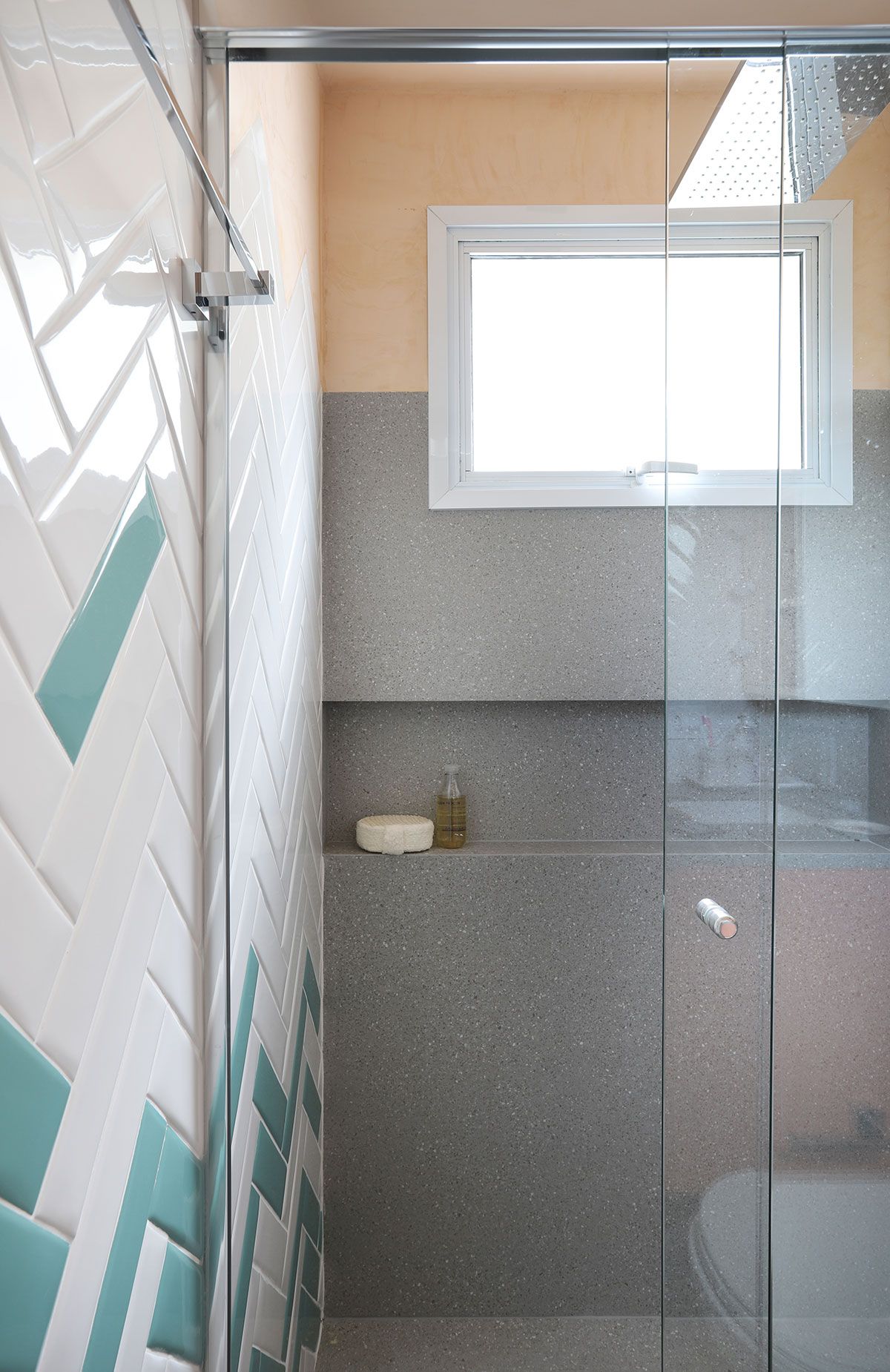 Todos os revestimentos escolhidos são, ou remetem, a materiais mais artesanais e brasileiros com custo relativamente baixo. O porcelanato, que imita um granilite, foi usado quase que na casa toda e escolhido por ter resistência maior.