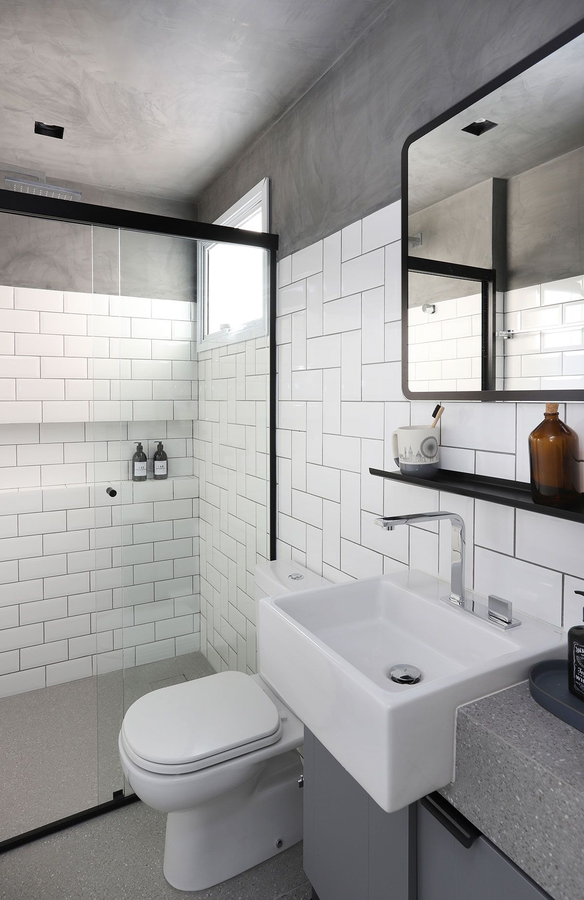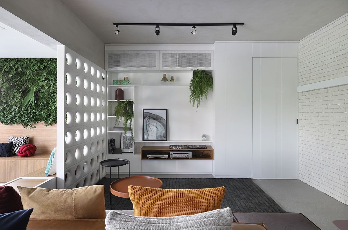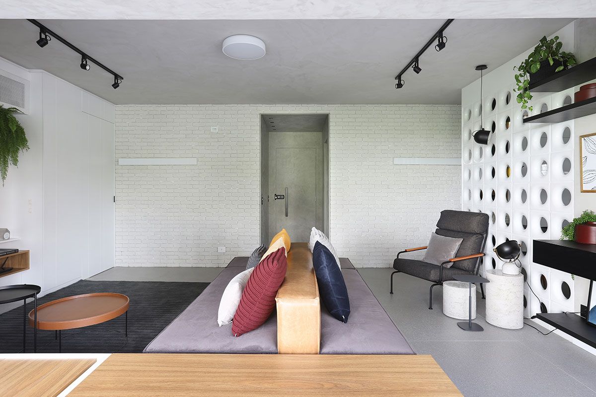 Outro material bem brasileiro usado na parede da sala foi o Brick Neve, que imita um tijolo branco e as peças foram dispostas com junta seca, ou seja, sem rejunte valorizando a irregularidade do material. A textura que imita cimento queimado foi aplicada em todas as paredes e no teto, também foi escolhida por ser um recurso com custo baixo e com grande efeito, além de proteger mais as paredes.
