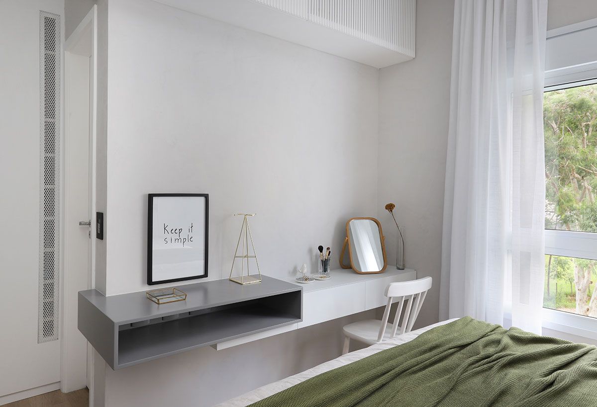 Somente a cozinha teve um pedido especial, logo no primeiro estudo o escritório optou em abrir a varanda e a cozinha totalmente, eles gostaram da ideia de ampliar, porém pediram para manter uma certa separação entre cada ambiente, especialmente a cozinha.