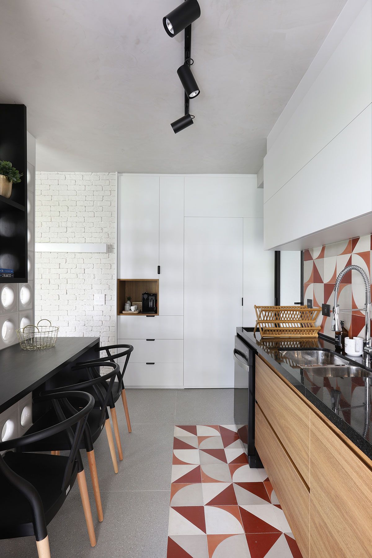 E para a cozinha o revestimento mais charmoso do projeto, o ladrilho hidráulico numa paginação desenvolvida pelo escritório que mescla desenhos geométricos em tons de vermelho e branco formando uma faixa na frente da bancada da cozinha se estendendo até a churrasqueira e se repetindo na parede acima da bancada.