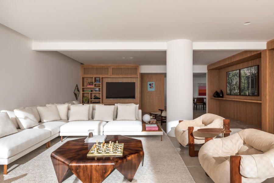 Um dos elementos centrais do projeto é o pilar arredondado no centro da sala, que organiza o ambiente em dois espaços complementares. De um lado está a sala de estar com TV, voltada ao cotidiano da família, e do outro, o living, ideal para receber convidados. Aproveitando a planta quadrada, a área social foi totalmente integrada à rotina contemporânea da família. O piso da sala também se destaca por unir personalidade e praticidade, ideal para uma casa com criança e cachorro.