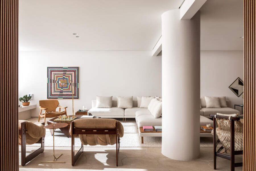 A decoração traz elementos afetivos, que reforçam a proposta de um lar com identidade e perfeito para receber visitas. A luminária de piso da sala pertenceu ao avô da cliente e foi restaurada pelas arquitetas. Já as cadeiras da sala de jantar foram adquiridas em um antiquário, antes mesmo de serem restauradas. O design nacional também é protagonista do projeto, com nomes como Zalzupin, Sergio Rodrigues, Paolo Ridolfi, Percival Lafer, Jader Almeida e Gustavo Bitencourt compondo os ambientes.