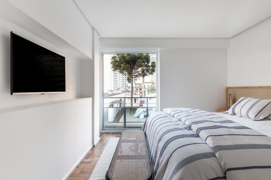 O lavabo, ponto de destaque do apartamento, surge como um ambiente mais escuro, cheio de personalidade e cor, reforçando o contraste presente em todo o projeto. A área íntima conta com três suítes, todas com base neutra e uso de tramas naturais, como palha, linho e cores suaves.