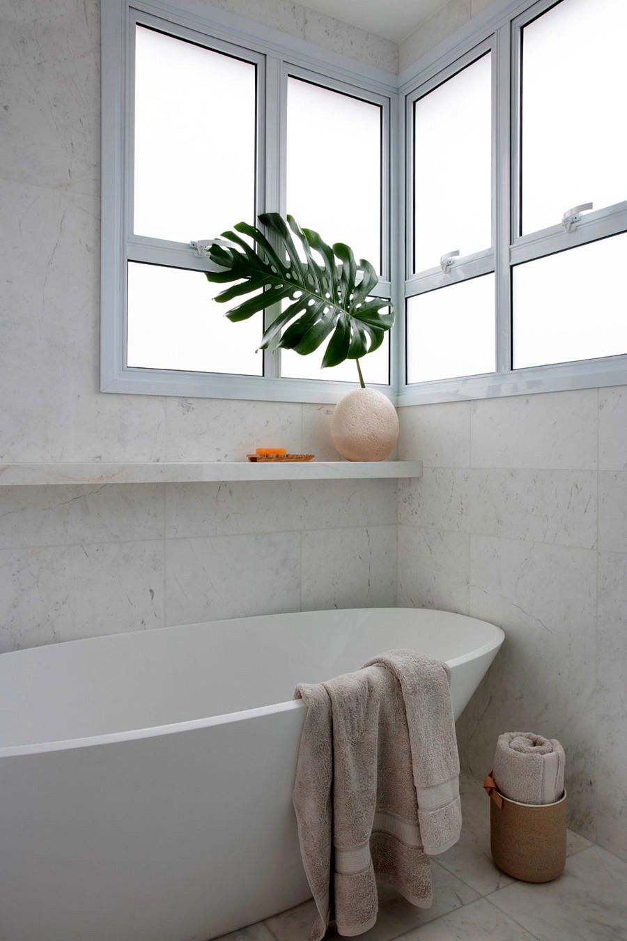 O banheiro tem divisão de espaço para cada pessoa e banheira para momentos de relaxar. A moradora precisava de armário para acomodar grande uma quantidade de roupas e acessórios e para isso foi feita marcenaria sob medida, utilizando madeira freijó e considerando espaços com bastante funcionalidade.