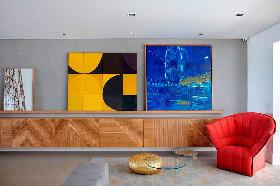 Acompanhando as salas de estar e de jantar, o imponente buffet desenhado sob medida para o projeto, acompanhado de uma longa calha para quadros. Obras de arte contemporânea compõem o ambiente e valorizam a marcenaria que integra os ambientes.