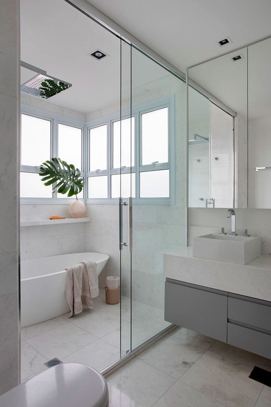 O banheiro tem divisão de espaço para cada pessoa e banheira para momentos de relaxar. A moradora precisava de armário para acomodar grande uma quantidade de roupas e acessórios e para isso foi feita marcenaria sob medida, utilizando madeira freijó e considerando espaços com bastante funcionalidade.