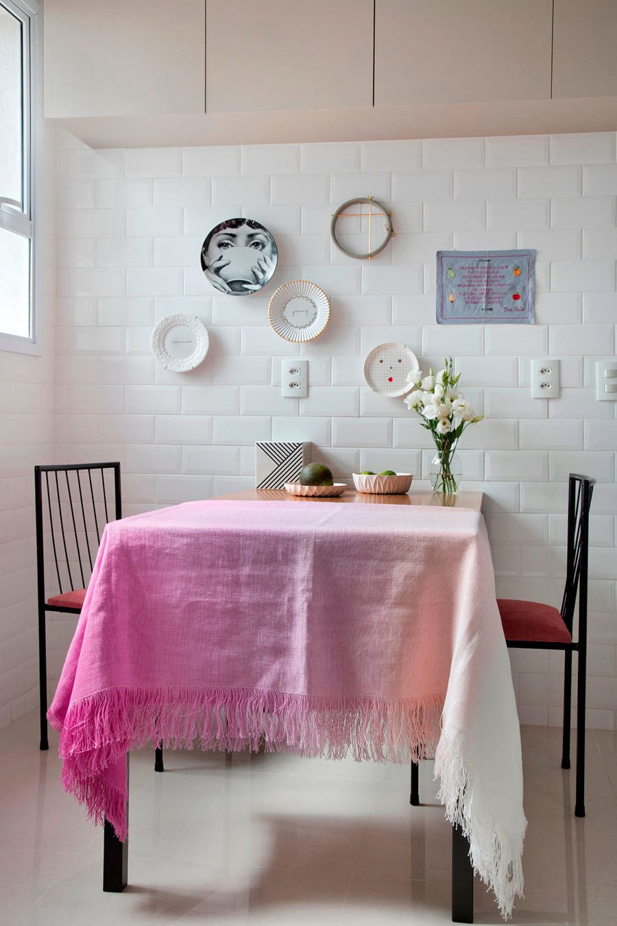 O quadro-inspiração de Newton Mesquita foi a base para escolha do tom da mesa Clami que ganha um toque especial com luminária
