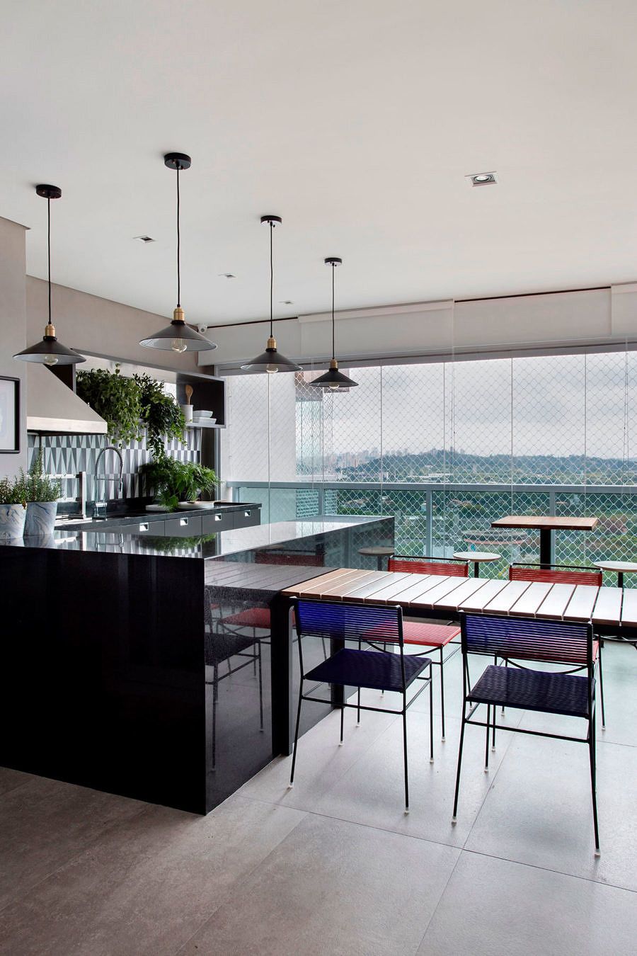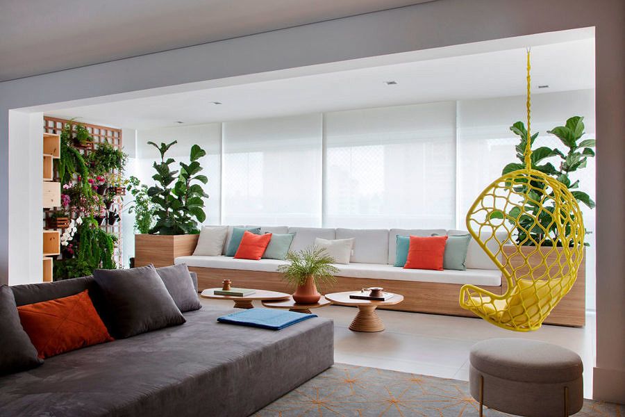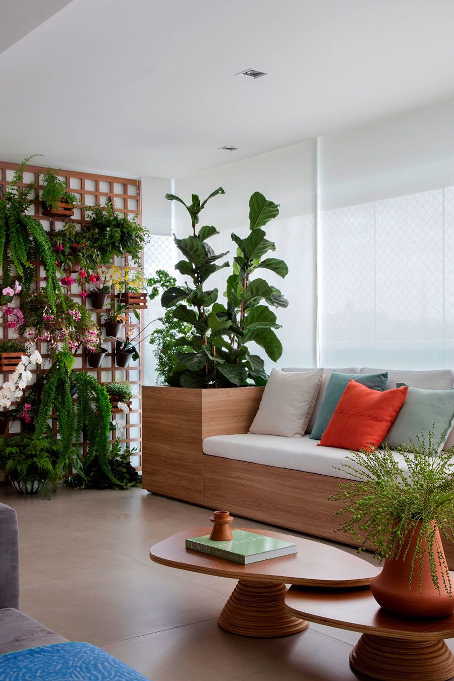 Ao entrar no apartamento o longo banco sob medida convida para aproveitar a varanda entre amigos ou apenas sentar para uma boa leitura. Nas pontas do banco, espaços para grandes vasos além de um jardim vertical, que trazem vida e conforto para o espaço.
