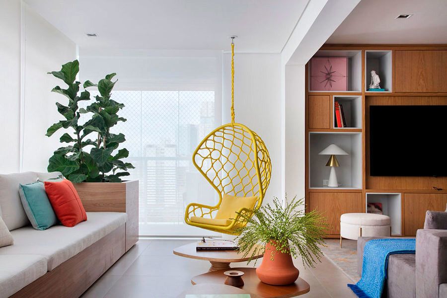 Um casal procurou o escritório Melina Romano Interiores, pois gostaria de aproveitar ao máximo o potencial das medidas do apartamento de 250m², em Pinheiros, São Paulo. O ponto de partida criativo foi o quadro azul do Newton Mesquita, o favorito do casal, e para utilizar o espaço da melhor forma um único sofá conecta as salas de televisão e de estar.