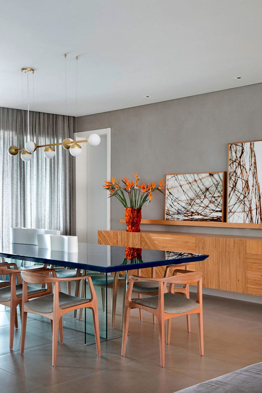 Acompanhando as salas de estar e de jantar, o imponente buffet desenhado sob medida para o projeto, acompanhado de uma longa calha para quadros. Obras de arte contemporânea compõem o ambiente e valorizam a marcenaria que integra os ambientes.