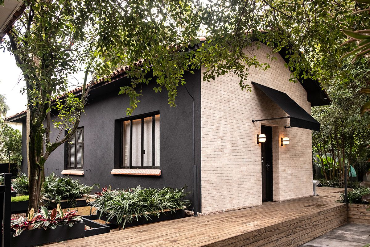 Abraçando a entrada, uma bancada de granilite com fundo preto pontilhado por pedras brancas e douradas dá o toque modernista.