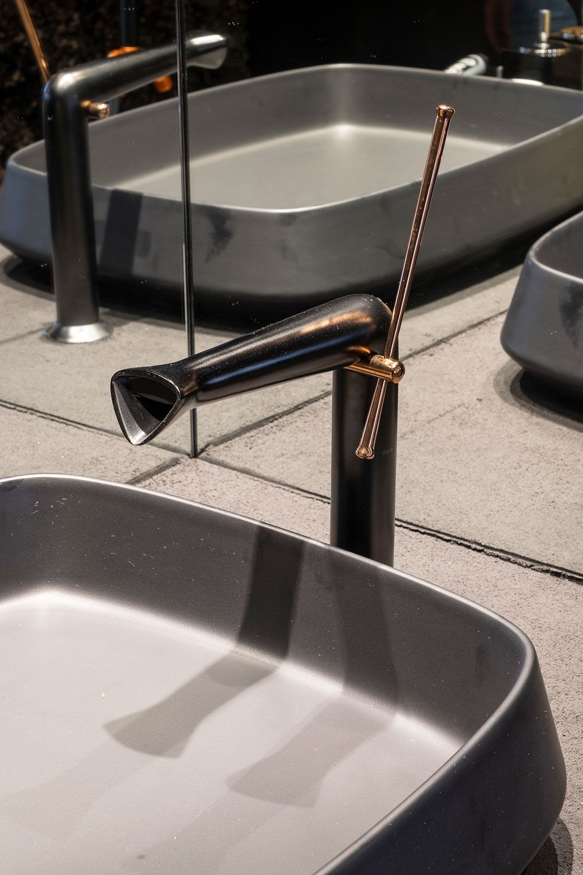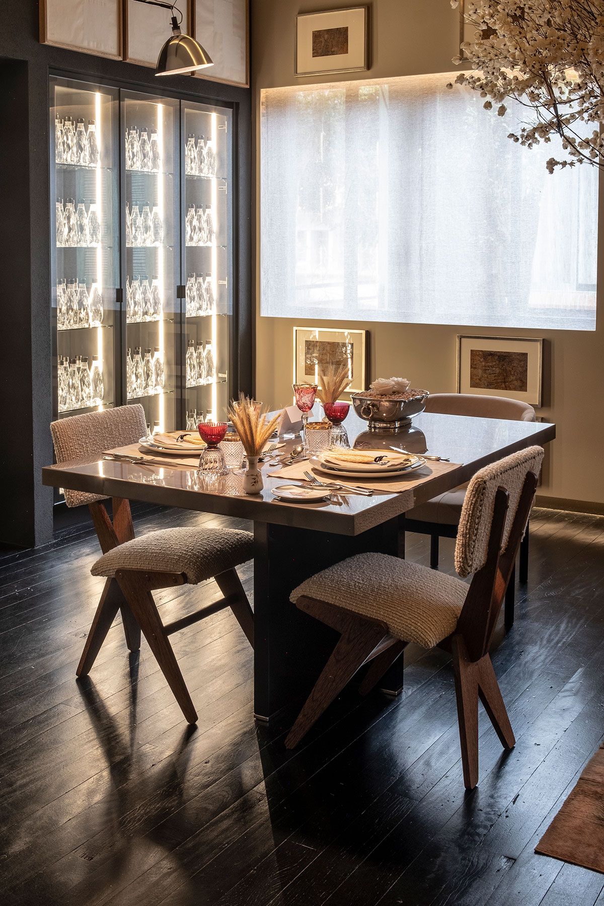 O partido arquitetônico contracena com a madeira no piso ebanizado e com as três tesouras em preto high gloss do teto, estrategicamente recortadas pelo profissional em um bem sucedido exercício de rigor construtivo-arquitetônico. Seguindo o raciocínio construtivista, o piso de madeira ebanizada é ainda coberto por uma sobreposição geométrica.