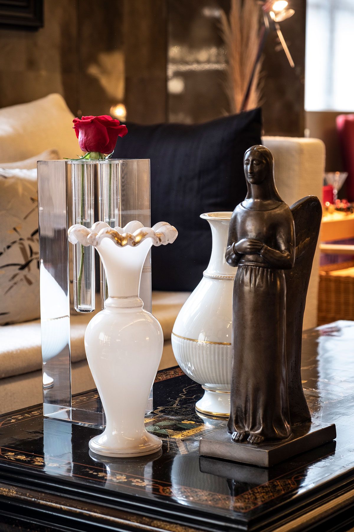 O espaço exibe duas obras de Tarsila do Amaral, que foram cedidas por colecionadores para o espaço do arquiteto Michel Safatle. Sobre a laca preta da mesa de centro, decorada com cenas do cotidiano, repousa a escultura “O Anjo” (1949/2004), em diálogo com o mais importante estudo a nanquim realizado no ano de 1923, em Paris, para a tela “A Negra“, também da pintora.