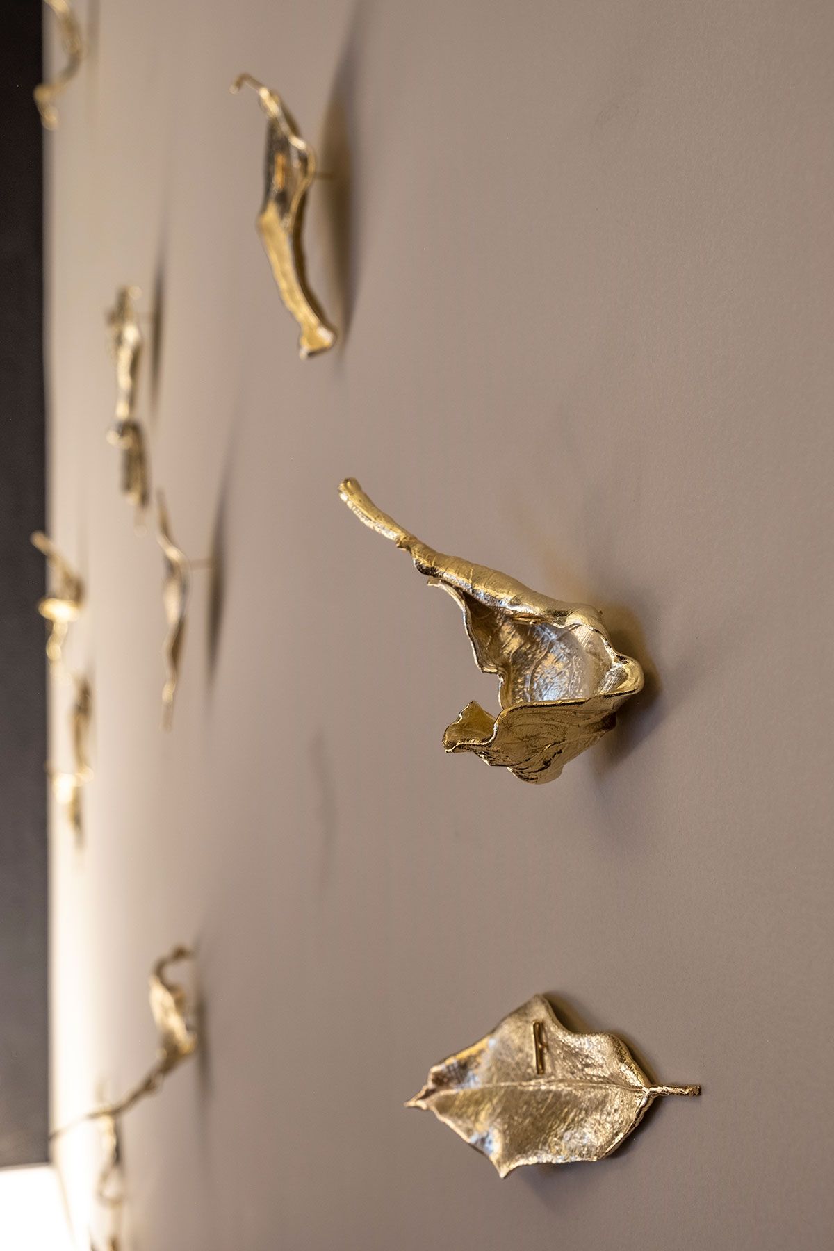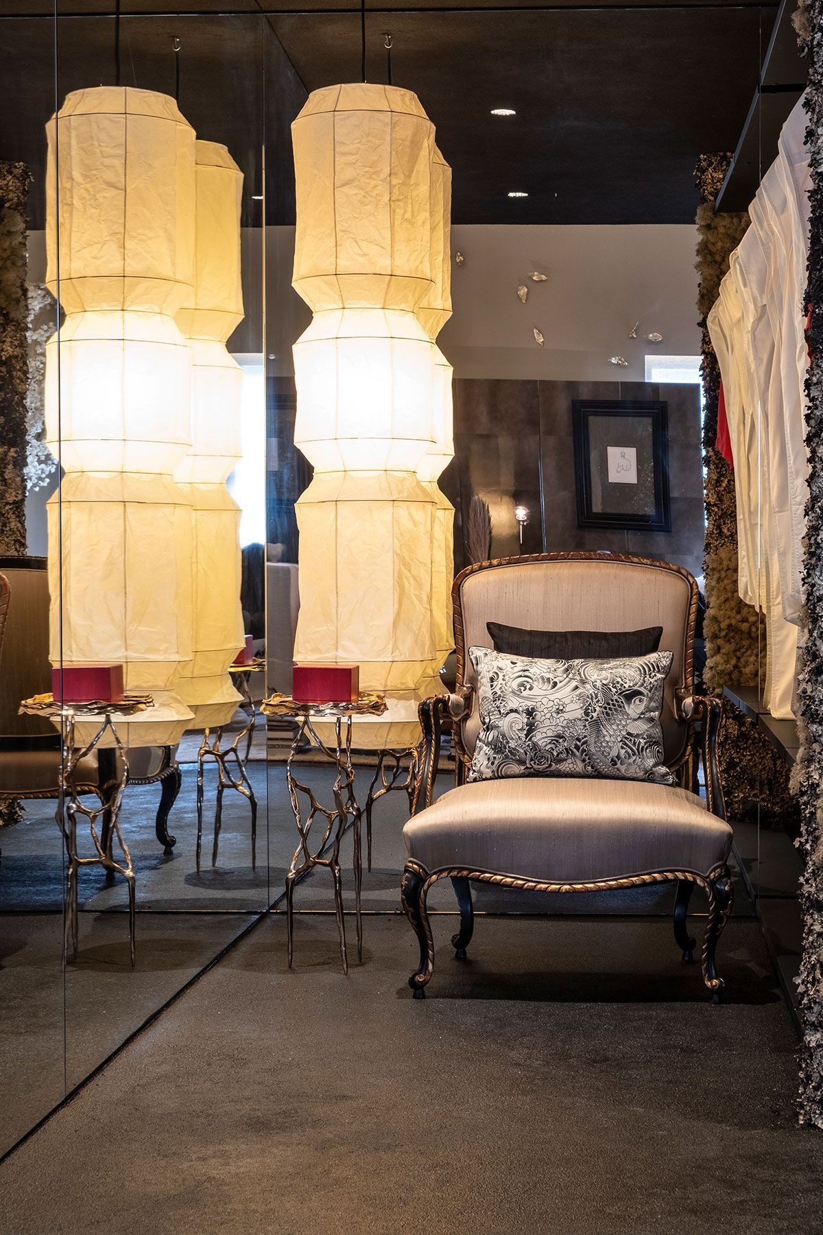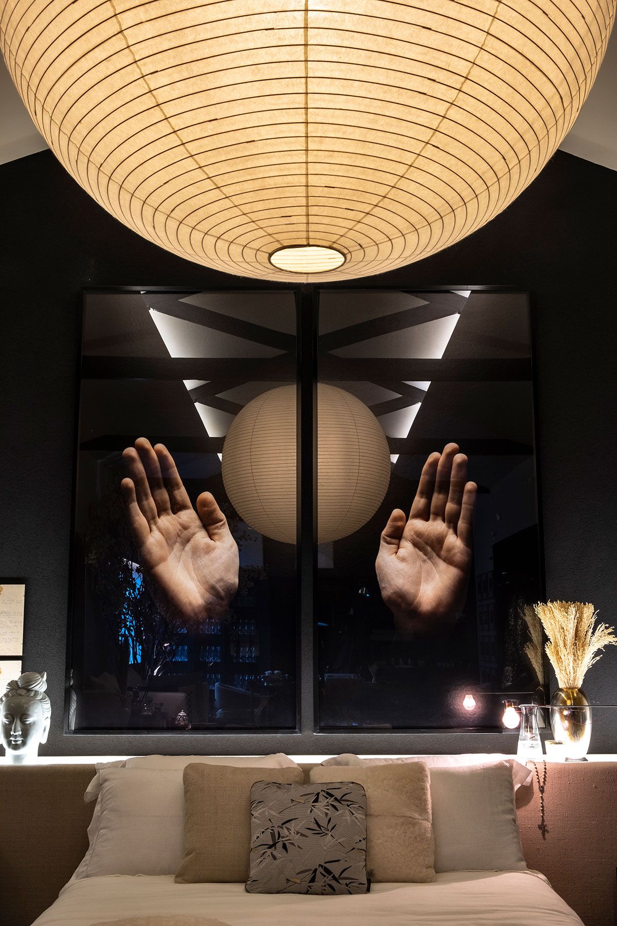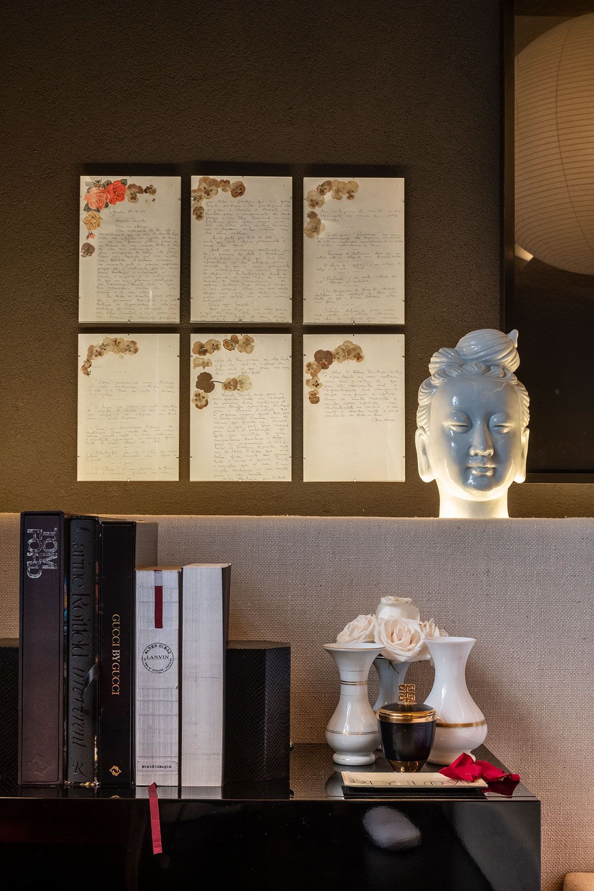O espaço exibe duas obras de Tarsila do Amaral, que foram cedidas por colecionadores para o espaço do arquiteto Michel Safatle. Sobre a laca preta da mesa de centro, decorada com cenas do cotidiano, repousa a escultura “O Anjo” (1949/2004), em diálogo com o mais importante estudo a nanquim realizado no ano de 1923, em Paris, para a tela “A Negra“, também da pintora.