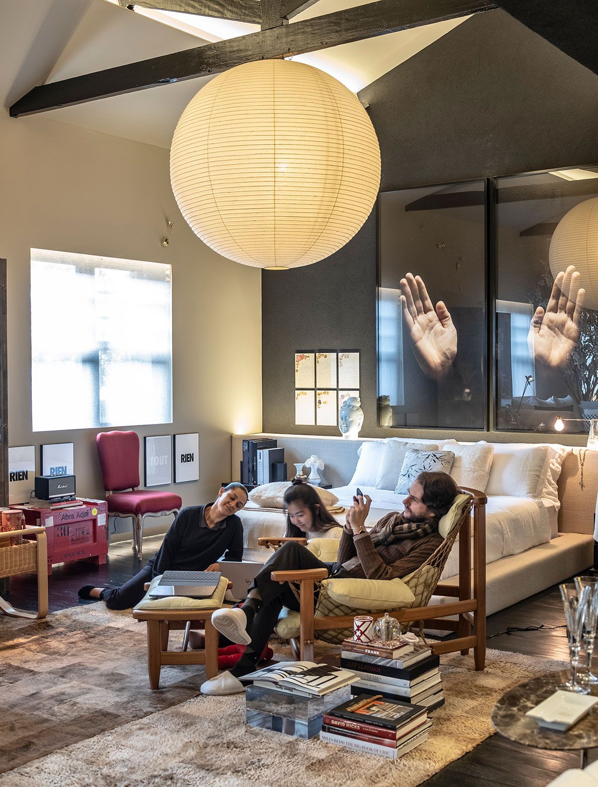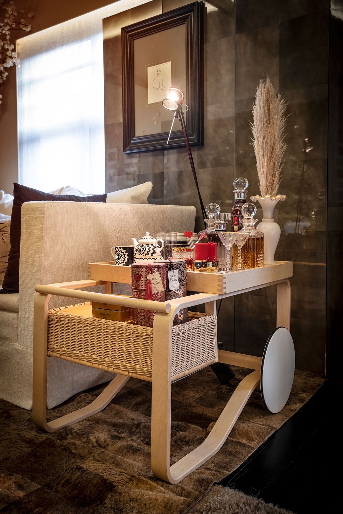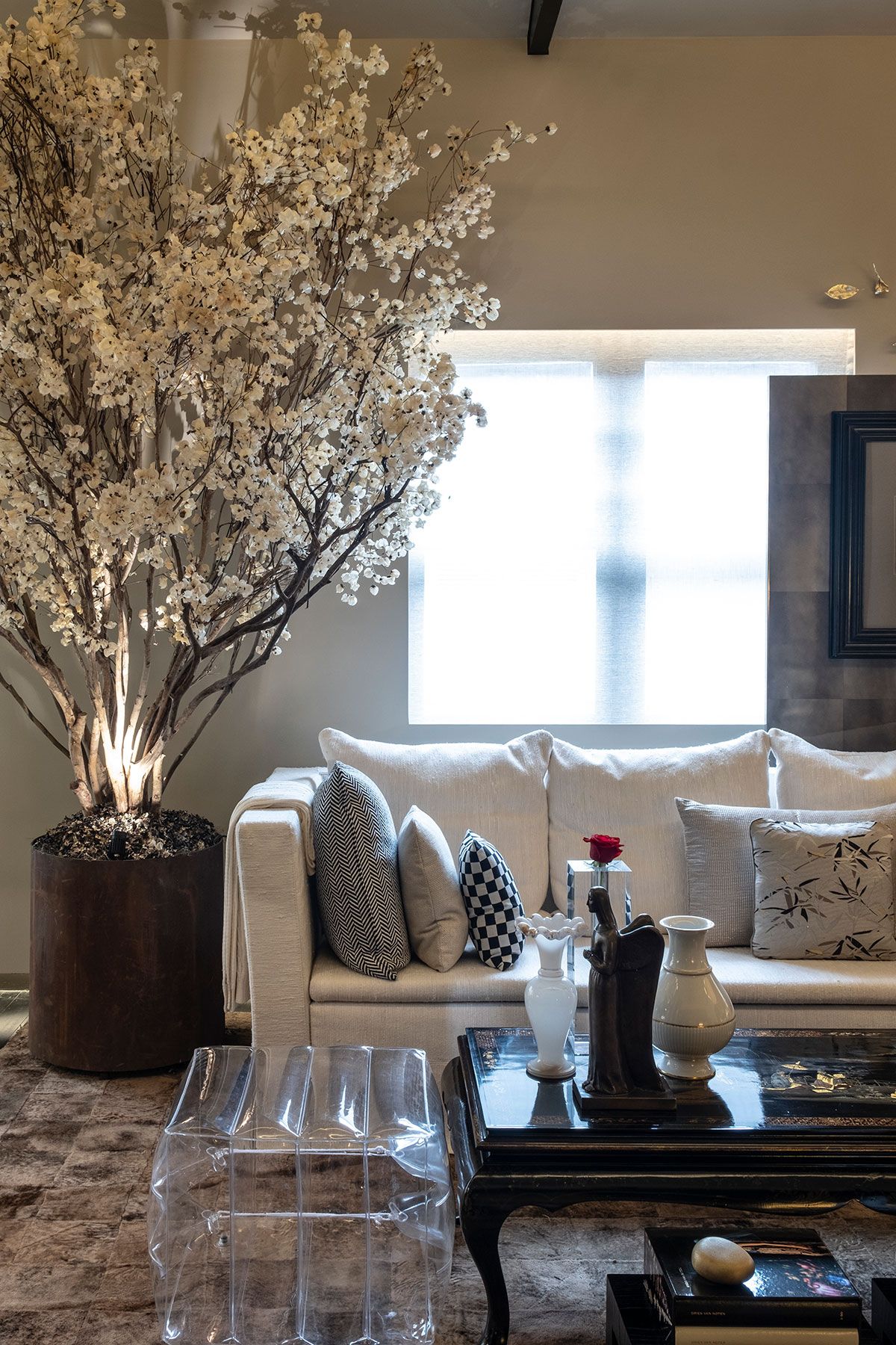 O espaço exibe duas obras de Tarsila do Amaral, que foram cedidas por colecionadores para o espaço do arquiteto Michel Safatle. Sobre a laca preta da mesa de centro, decorada com cenas do cotidiano, repousa a escultura “O Anjo” (1949/2004), em diálogo com o mais importante estudo a nanquim realizado no ano de 1923, em Paris, para a tela “A Negra“, também da pintora.