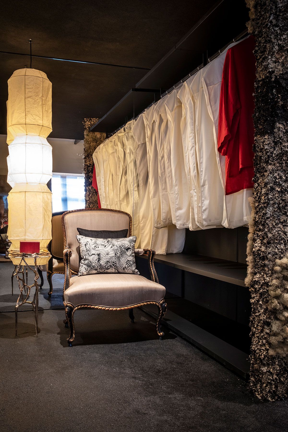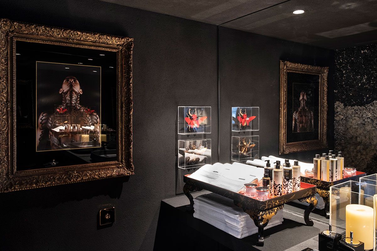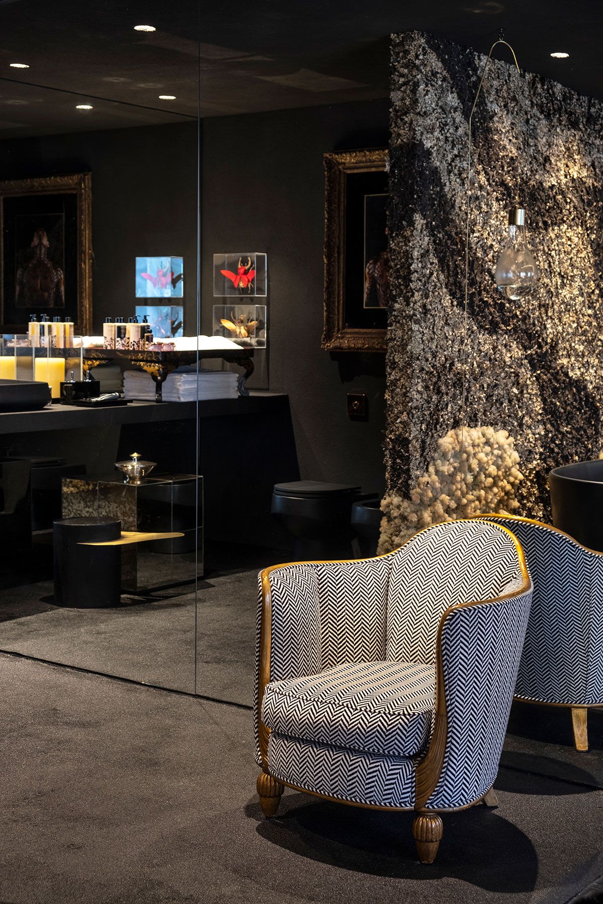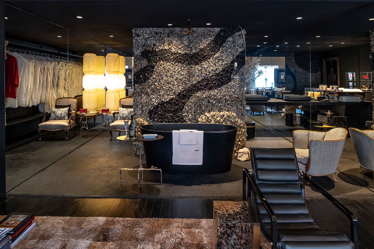 O espaço exibe duas obras de Tarsila do Amaral, que foram cedidas por colecionadores para o espaço do arquiteto Michel Safatle. Sobre a laca preta da mesa de centro, decorada com cenas do cotidiano, repousa a escultura “O Anjo” (1949/2004), em diálogo com o mais importante estudo a nanquim realizado no ano de 1923, em Paris, para a tela “A Negra“, também da pintora.
