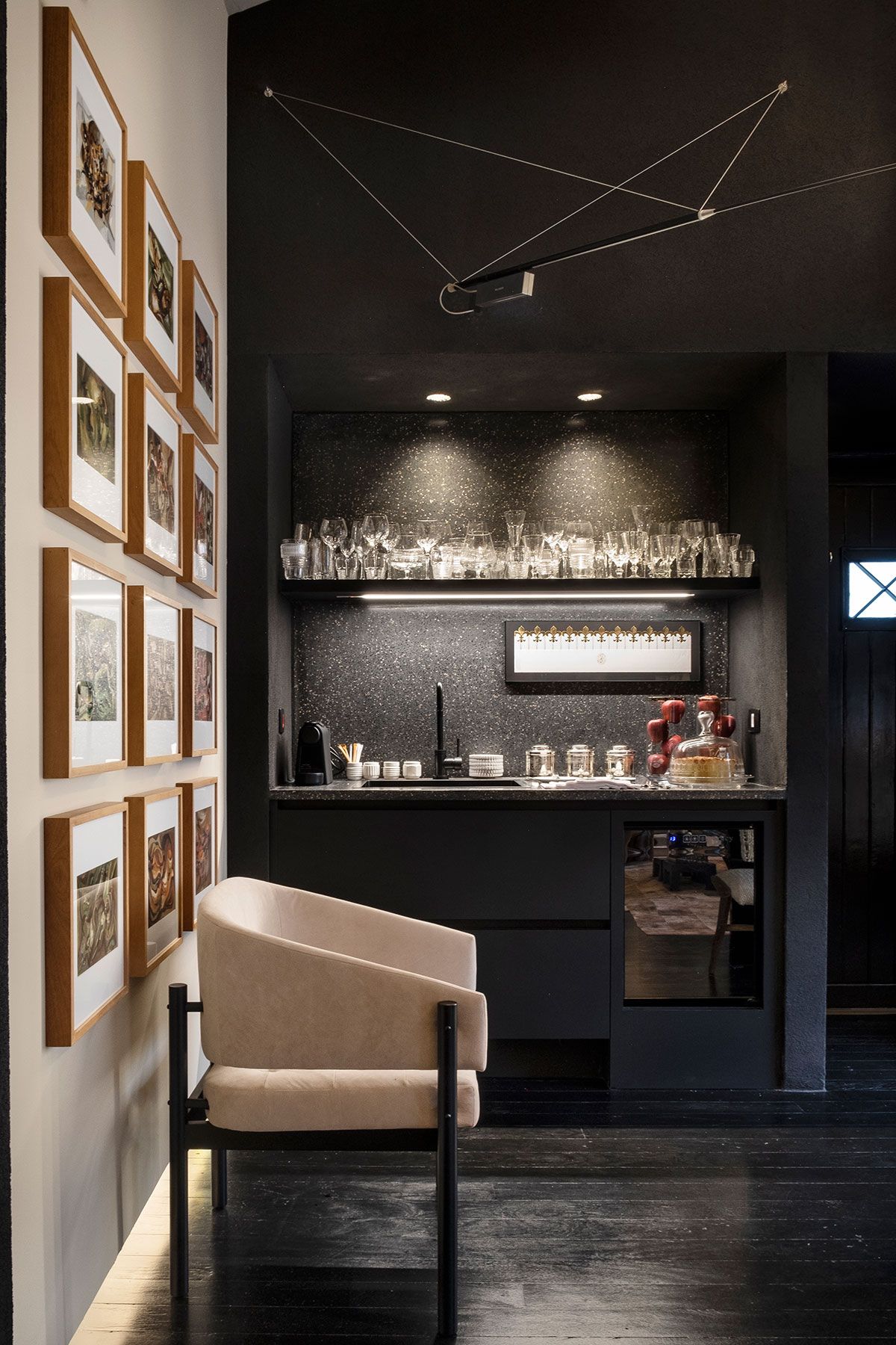 O partido arquitetônico contracena com a madeira no piso ebanizado e com as três tesouras em preto high gloss do teto, estrategicamente recortadas pelo profissional em um bem sucedido exercício de rigor construtivo-arquitetônico. Seguindo o raciocínio construtivista, o piso de madeira ebanizada é ainda coberto por uma sobreposição geométrica.