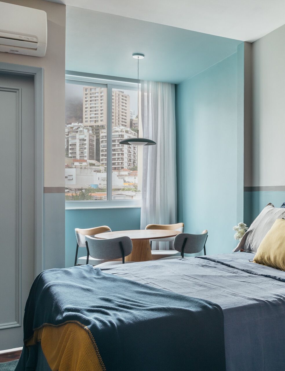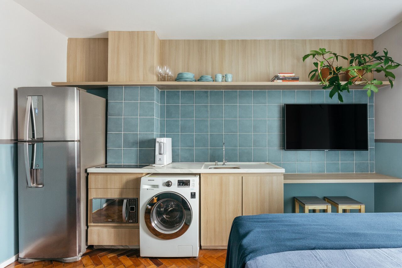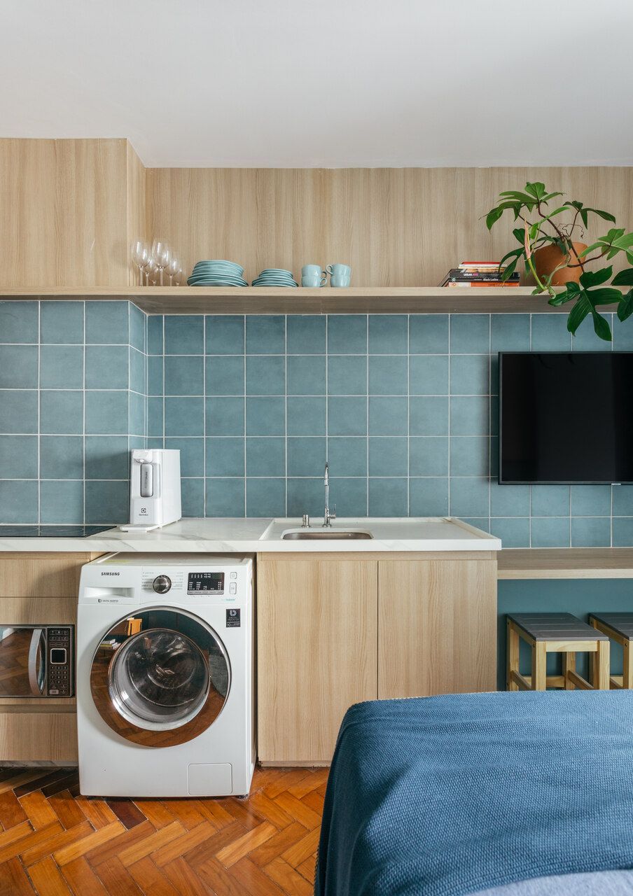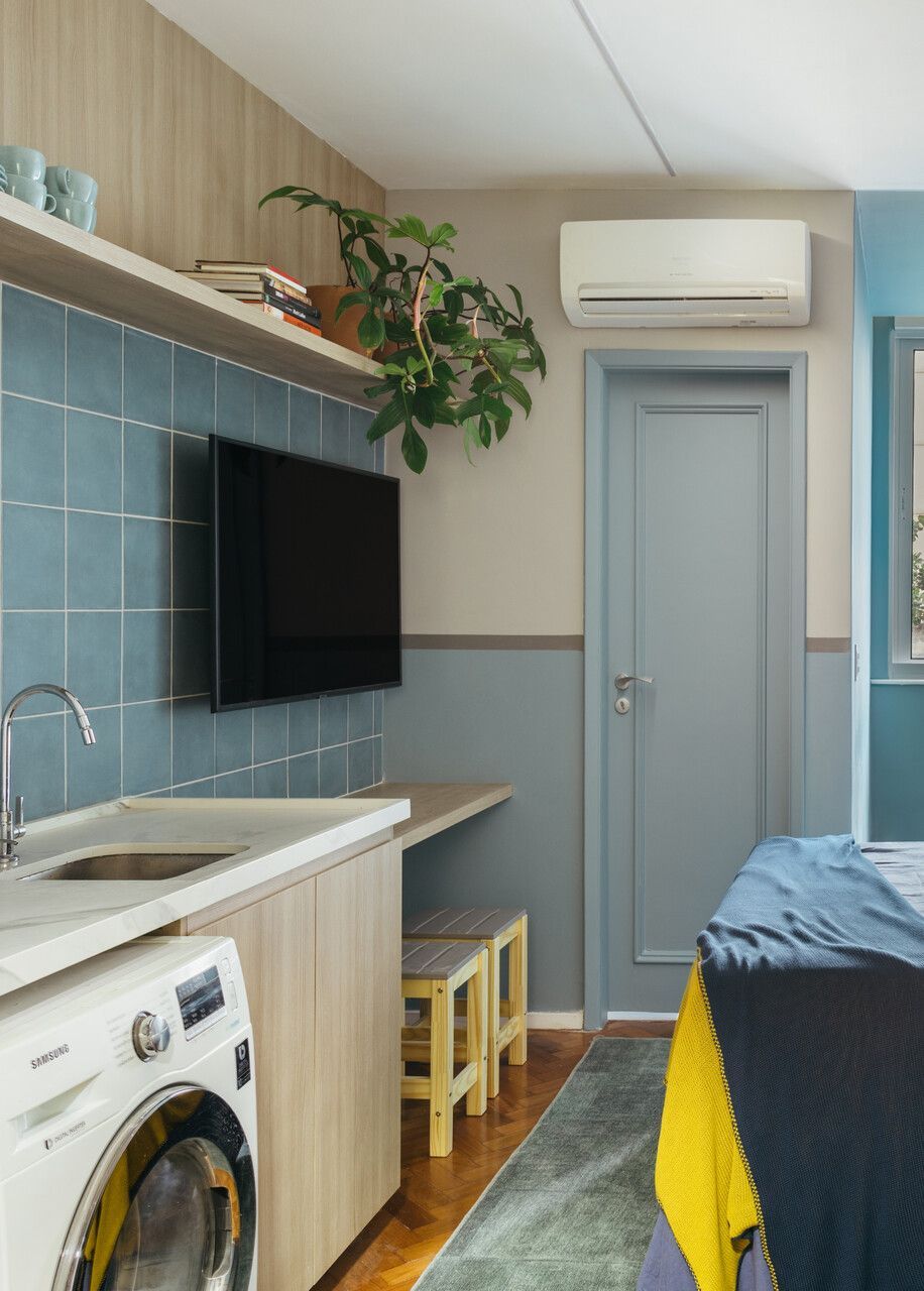O grande diferencial do projeto é o revestimento cerâmico azul que se estende por toda a parede em frente à cama, abrangendo a cozinha e a tv, acompanhado, na parte superior, por uma prateleira amadeirada que substitui os tradicionais armários. Outro destaque no projeto são as duas paredes pintadas de azul até meia altura, com rodameio pintado de cinza.