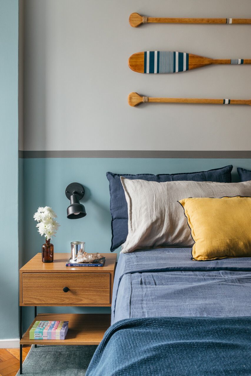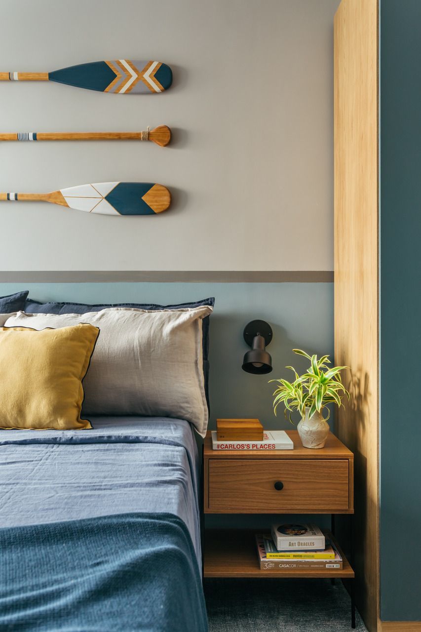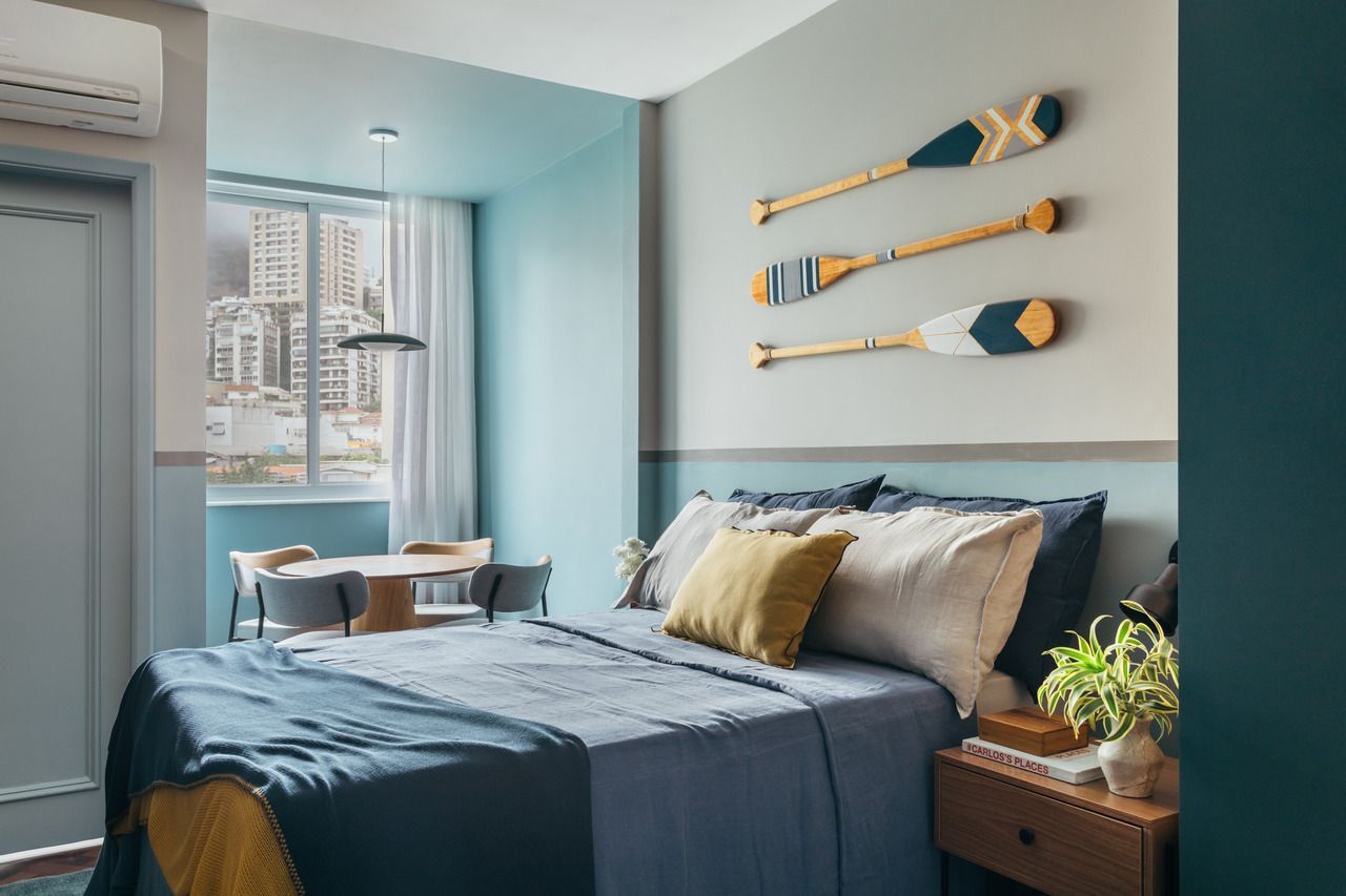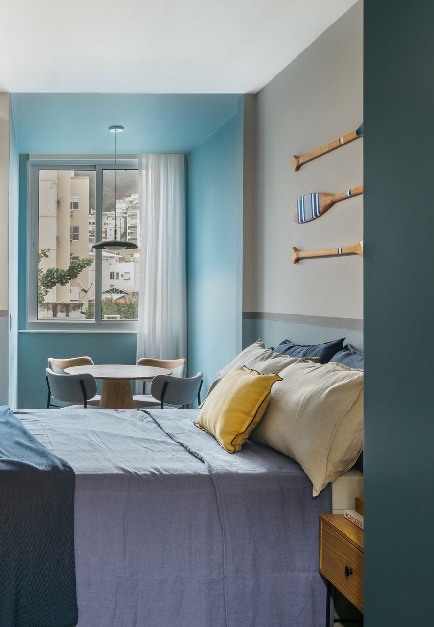 Na decoração é tudo novo, inclusive as louças e a roupa de cama, para que todos os elementos vibrassem na mesma linguagem visual. Para arrematar o clima praiano, no lugar do tradicional quadro, foram usados três remos decorativos na parede atrás da cama.