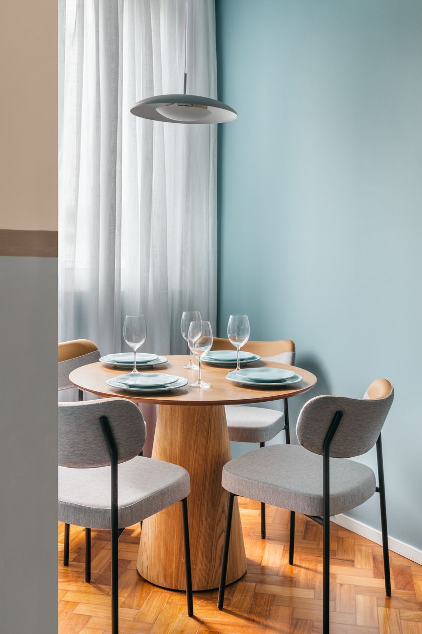 Sem alterar a planta original do imóvel, no geral, o projeto buscou criar um loft prático e confortável, com vários assentos para receber amigos, apesar de o espaço ser micro. Como a principal inspiração do arquiteto foi a proximidade com o mar, o azul rouba a cena na decoração, em tonalidades, materiais e acabamentos diversos.
