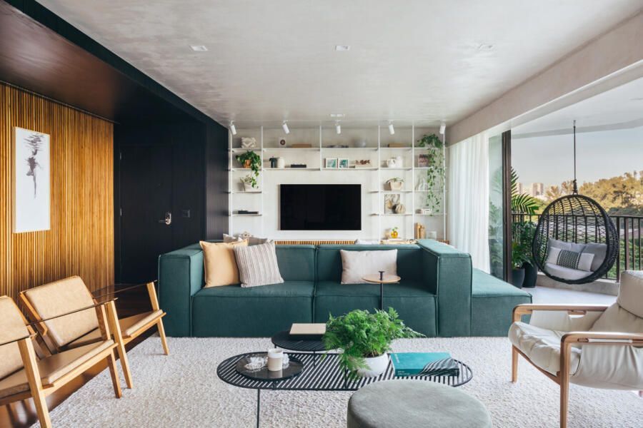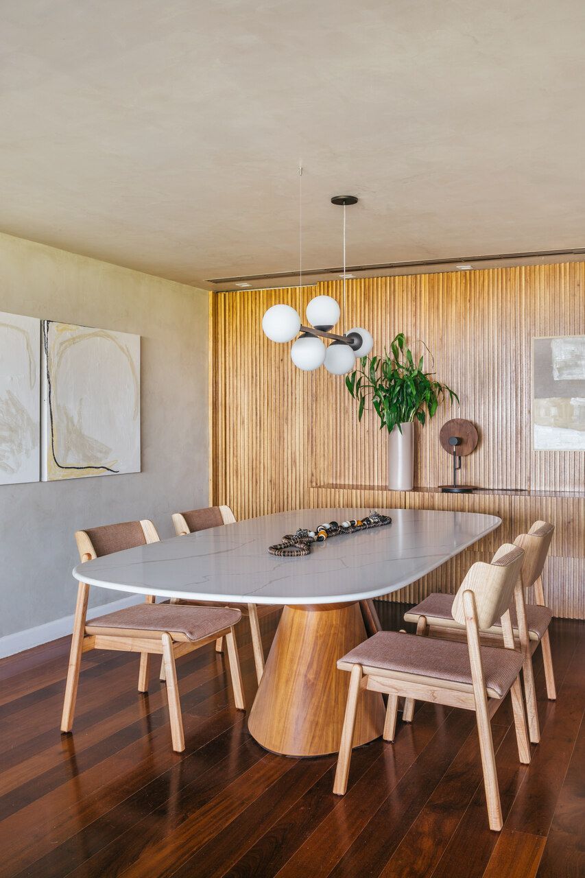 Na sala, o equilíbrio entre contenção e expressão se revela em escolhas precisas. Tons claros predominam, enquanto um sofá em ilha na cor verde, desenhado pelo próprio escritório, assume o papel de protagonista. O painel ripado em freijó natural estabelece uma conexão visual entre estar e jantar, aquecendo a base neutra que ganha leveza com paredes e teto em cimento queimado branco artesanal. O resultado é um ambiente que acolhe sem excessos, mas com personalidade evidente.