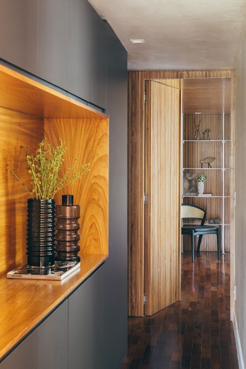 Na área íntima, a continuidade material garante unidade ao projeto. A madeira aparece em diálogo com tons neutros, criando uma atmosfera serena na suíte do casal, enquanto os pisos originais em angelim foram restaurados, preservando a memória do imóvel. Cada escolha parece responder a uma lógica silenciosa, que valoriza tanto a estética quanto o conforto cotidiano.