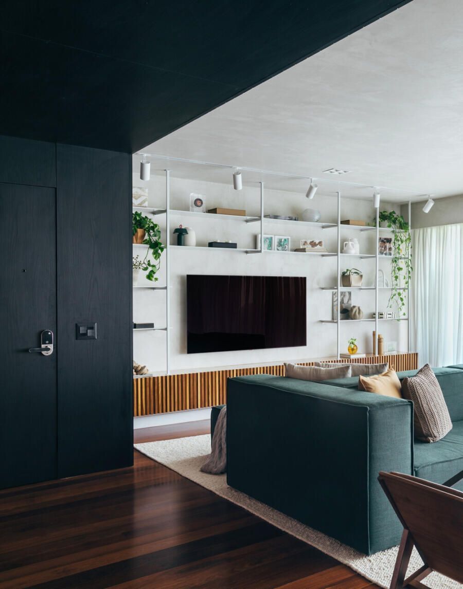 “Quando surgiu a oportunidade de comprar um apartamento maior no mesmo condomínio, pedimos ao Rafa e ao Sandro que traduzissem esse novo momento da nossa família em um projeto que fosse ao mesmo tempo acolhedor e atemporal. Queríamos uma casa integrada, funcional e que valorizasse ao máximo a vista, que sempre foi um dos nossos maiores desejos.