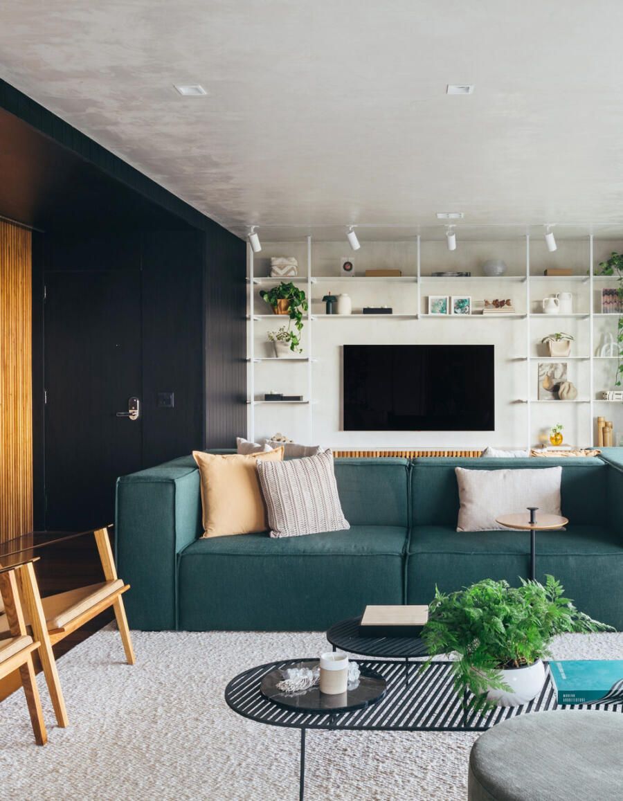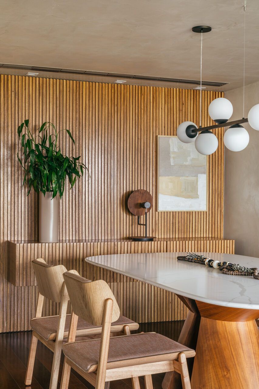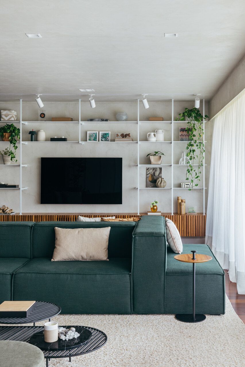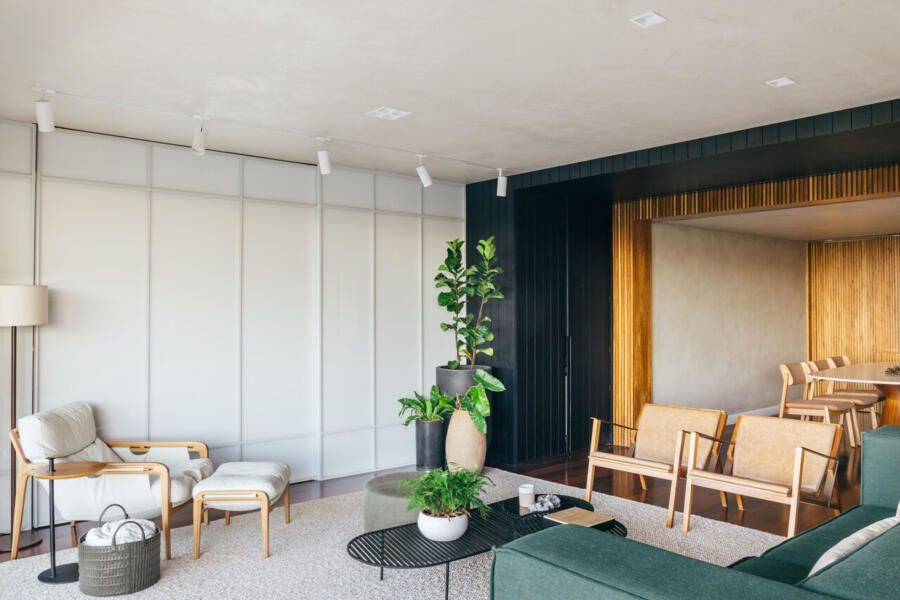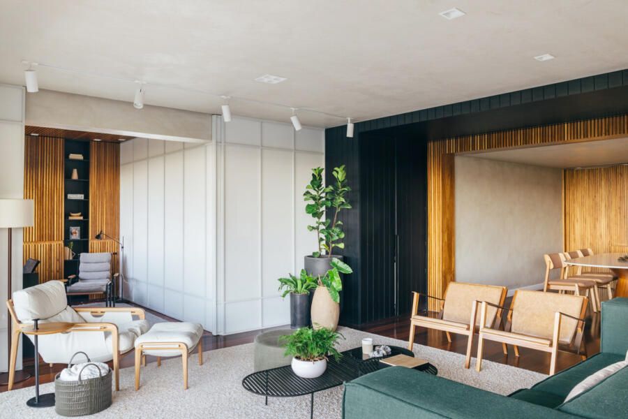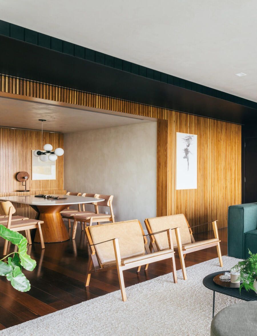 Na sala, o equilíbrio entre contenção e expressão se revela em escolhas precisas. Tons claros predominam, enquanto um sofá em ilha na cor verde, desenhado pelo próprio escritório, assume o papel de protagonista. O painel ripado em freijó natural estabelece uma conexão visual entre estar e jantar, aquecendo a base neutra que ganha leveza com paredes e teto em cimento queimado branco artesanal. O resultado é um ambiente que acolhe sem excessos, mas com personalidade evidente.