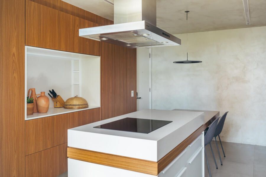 A fluidez dos espaços é potencializada por soluções flexíveis, como os painéis de correr em serralheria com vidro branco, que permitem integrar ou isolar o escritório e a área de serviço conforme a necessidade. Essa versatilidade atende ao ritmo da casa sem comprometer a entrada de luz natural, reforçando a sensação de amplitude. Na cozinha, a ilha central organiza a circulação contínua e mantém o diálogo com a linguagem minimalista presente em todo o projeto.