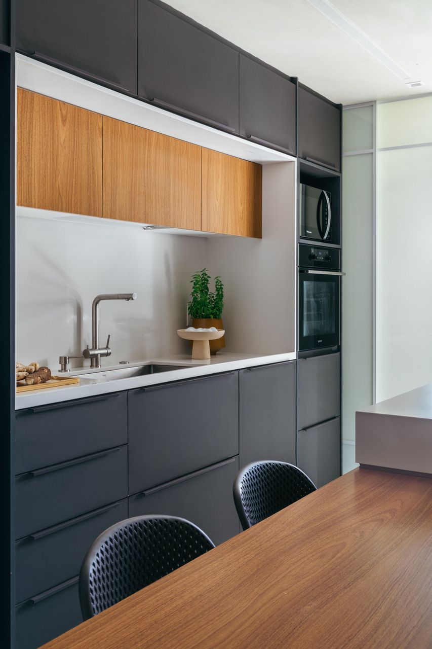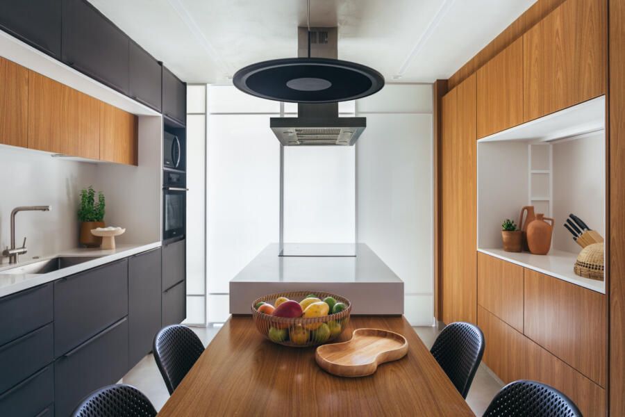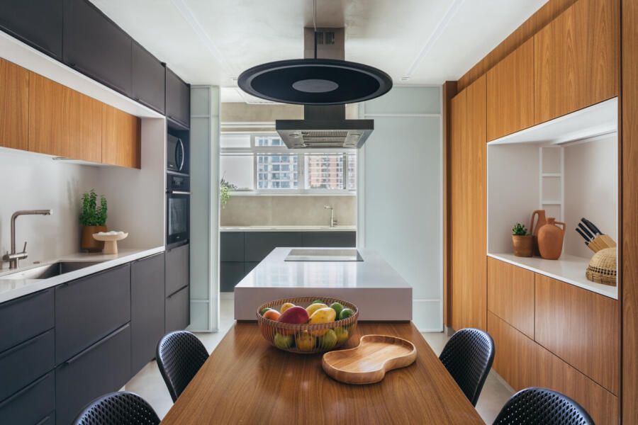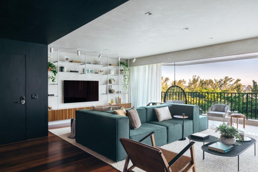 “Quando surgiu a oportunidade de comprar um apartamento maior no mesmo condomínio, pedimos ao Rafa e ao Sandro que traduzissem esse novo momento da nossa família em um projeto que fosse ao mesmo tempo acolhedor e atemporal. Queríamos uma casa integrada, funcional e que valorizasse ao máximo a vista, que sempre foi um dos nossos maiores desejos.