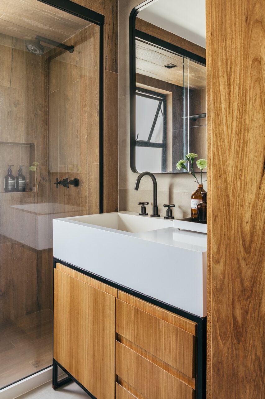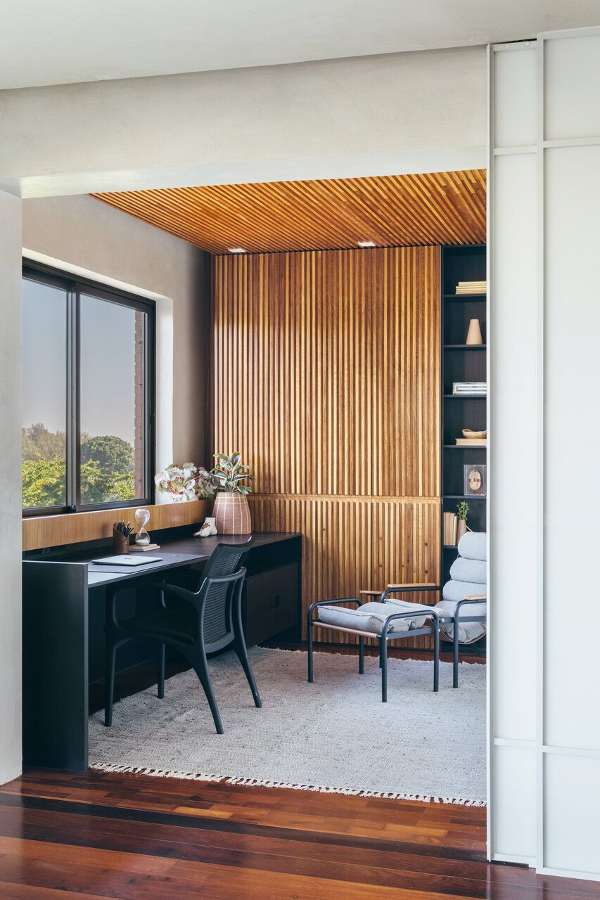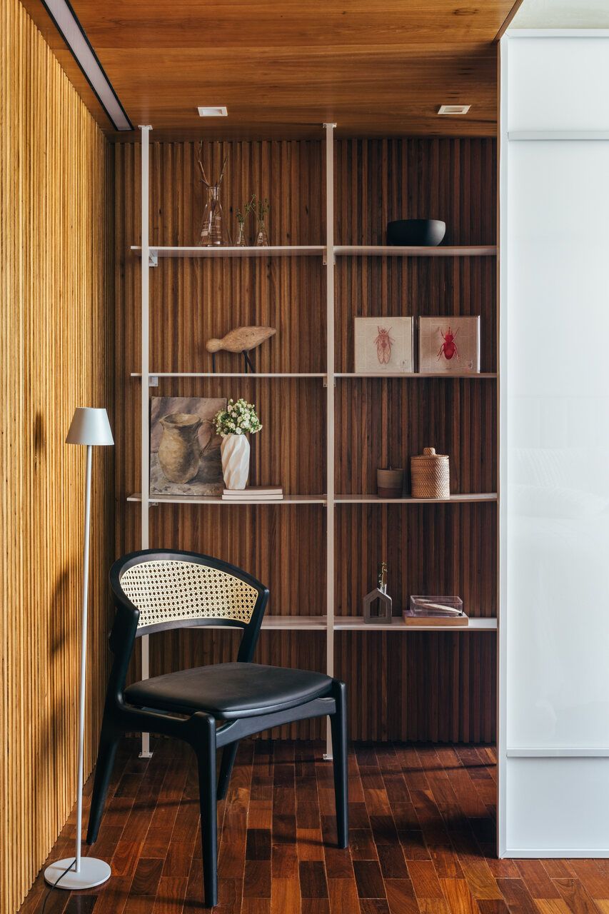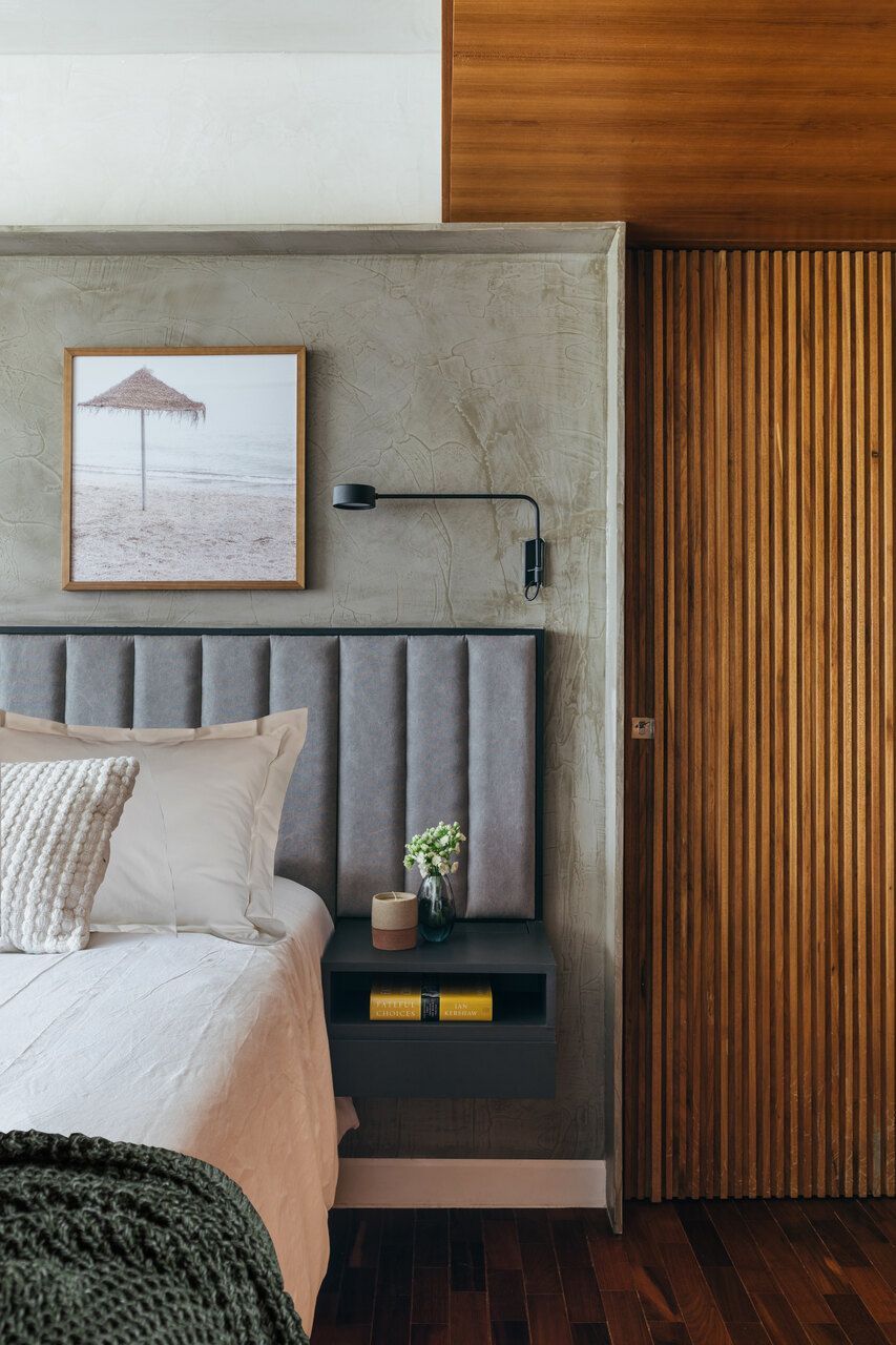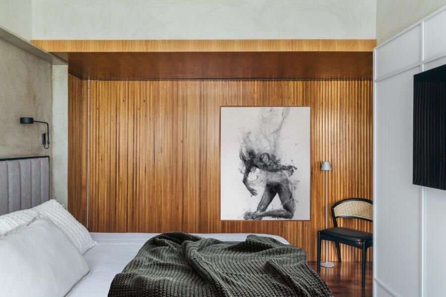 Na área íntima, a continuidade material garante unidade ao projeto. A madeira aparece em diálogo com tons neutros, criando uma atmosfera serena na suíte do casal, enquanto os pisos originais em angelim foram restaurados, preservando a memória do imóvel. Cada escolha parece responder a uma lógica silenciosa, que valoriza tanto a estética quanto o conforto cotidiano.