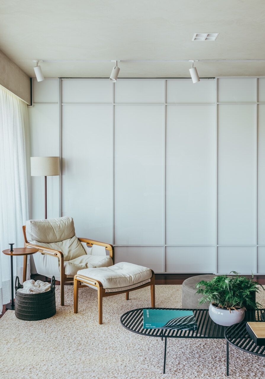 A curadoria de mobiliário reforça a identidade brasileira do apartamento, com peças assinadas que convivem com elementos desenhados sob medida. Entre os destaques estão a chaise com banqueta Alice, de Aristeu Pires, as mesas de centro Bisco + Grelha, da Basi.co Design, e a poltrona Trevo Drink, de Felipe Protti. Do acervo original, apenas a base da mesa de jantar foi mantida, recebendo um novo tampo e se integrando naturalmente à nova composição.