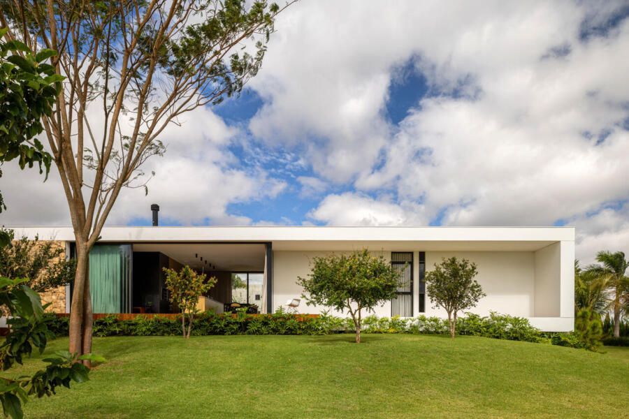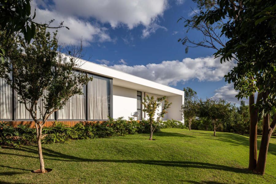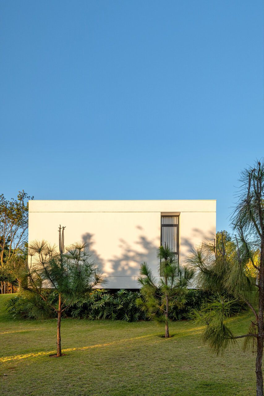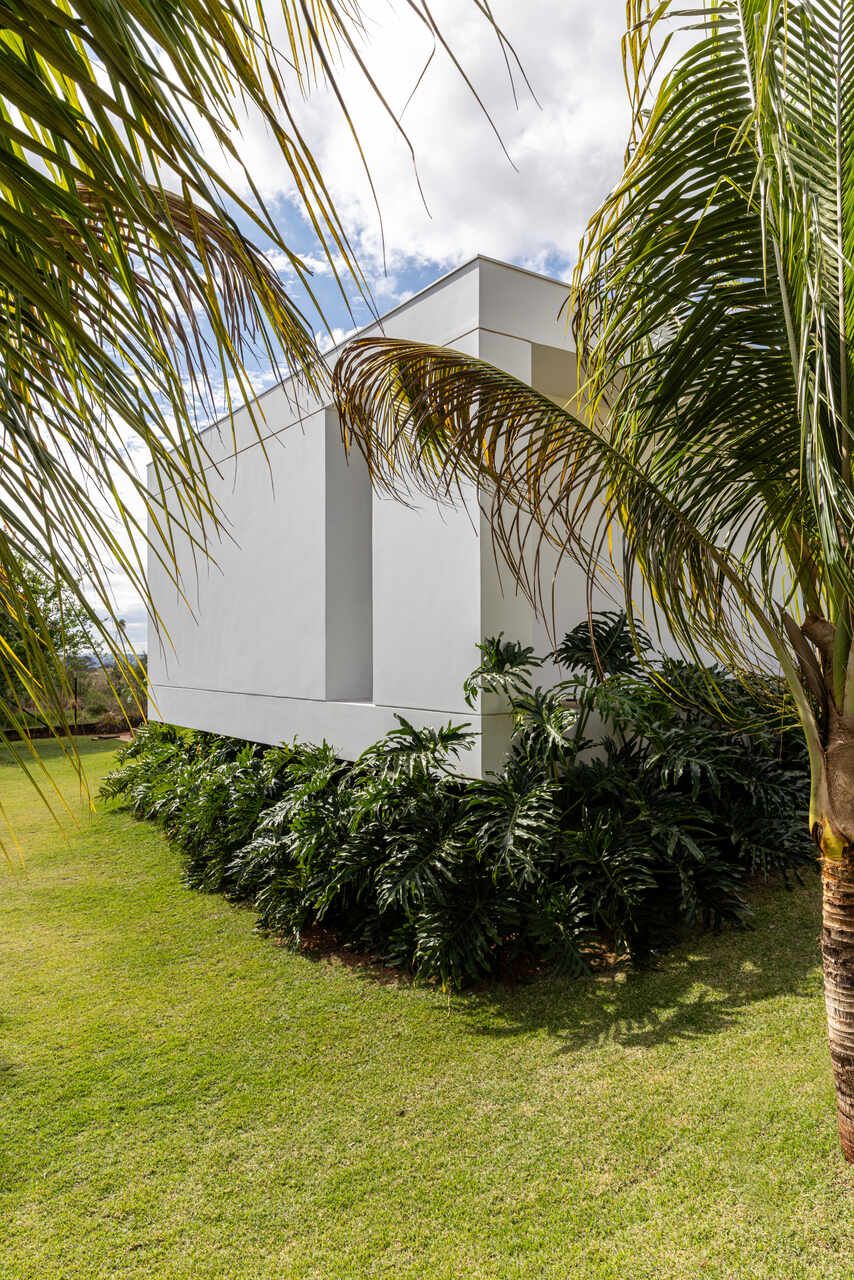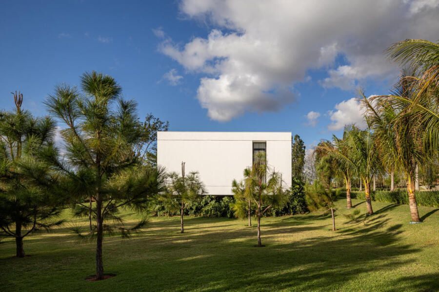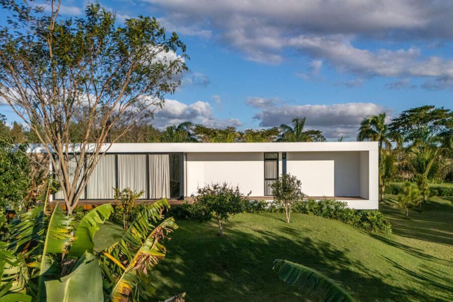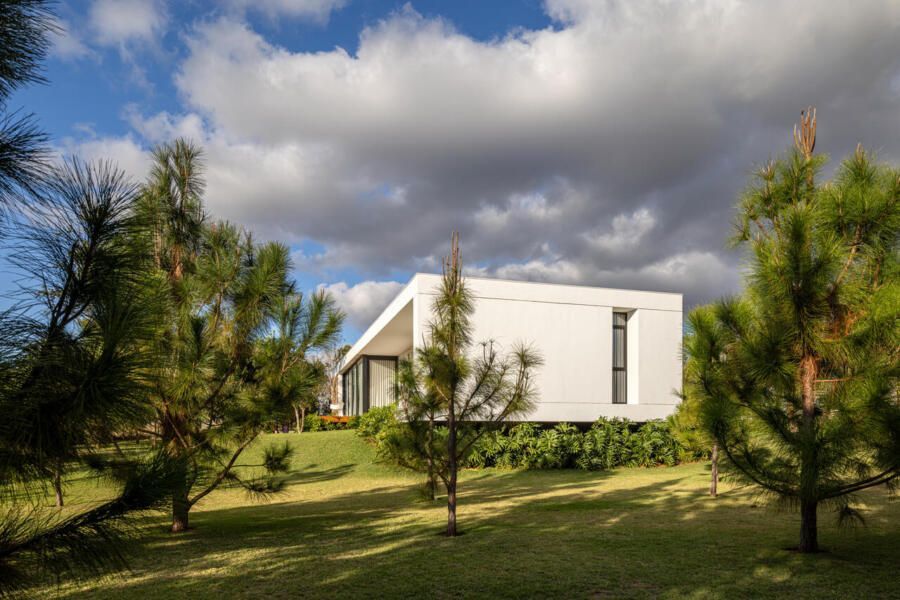 Com 205m², o projeto concluído em 2019 (com obra finalizada em 2020 e interiores executados em 2022), apresenta geometria simples e caráter minimalista. Trata-se de um único volume térreo, branco e monolítico, sutilmente elevado do solo. A laje de piso, apoiada em vigas recuadas e posicionada 50 centímetros acima do terreno, intensifica a sensação de leveza estrutural. A composição é contida, permitindo que o entorno natural assuma protagonismo.