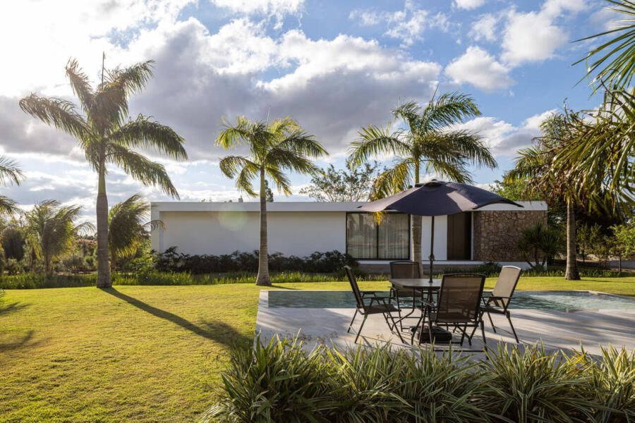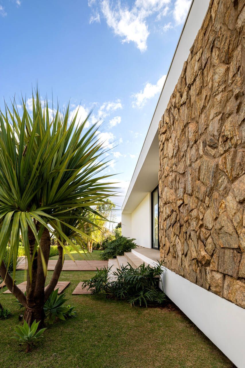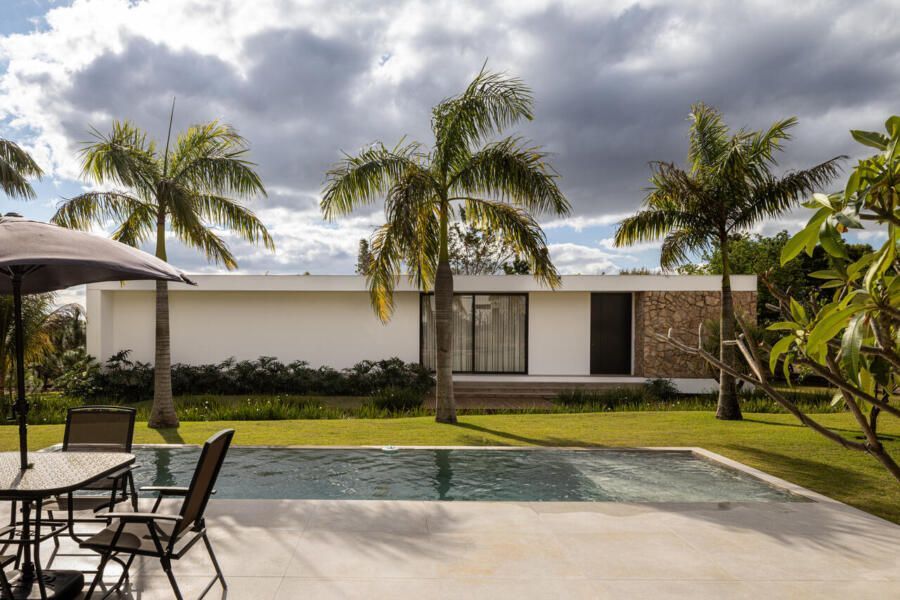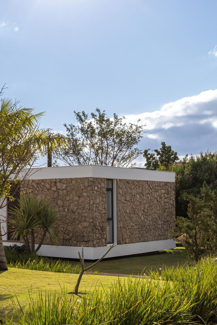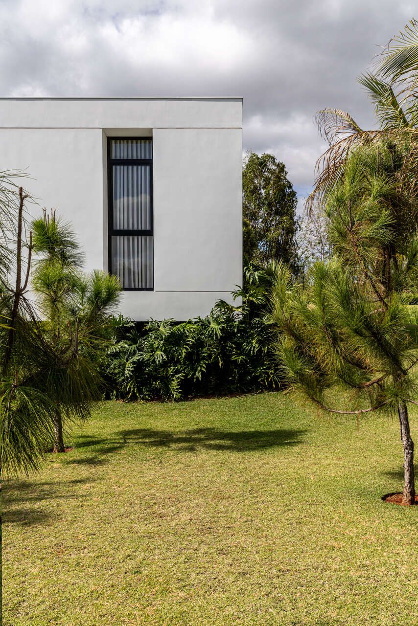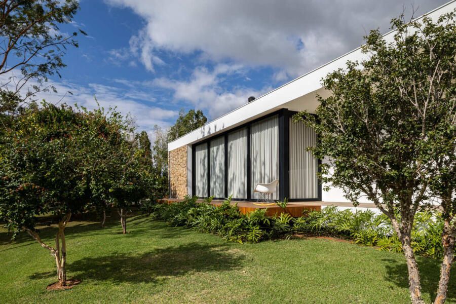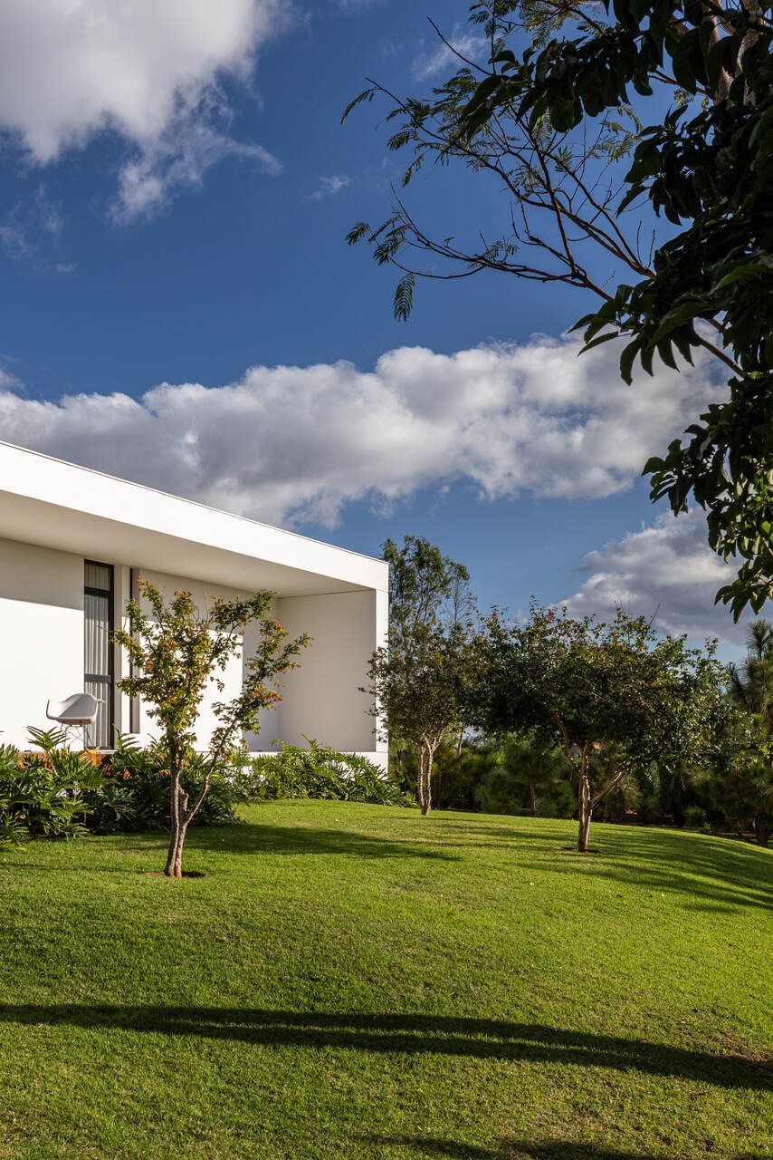 Com 205m², o projeto concluído em 2019 (com obra finalizada em 2020 e interiores executados em 2022), apresenta geometria simples e caráter minimalista. Trata-se de um único volume térreo, branco e monolítico, sutilmente elevado do solo. A laje de piso, apoiada em vigas recuadas e posicionada 50 centímetros acima do terreno, intensifica a sensação de leveza estrutural. A composição é contida, permitindo que o entorno natural assuma protagonismo.