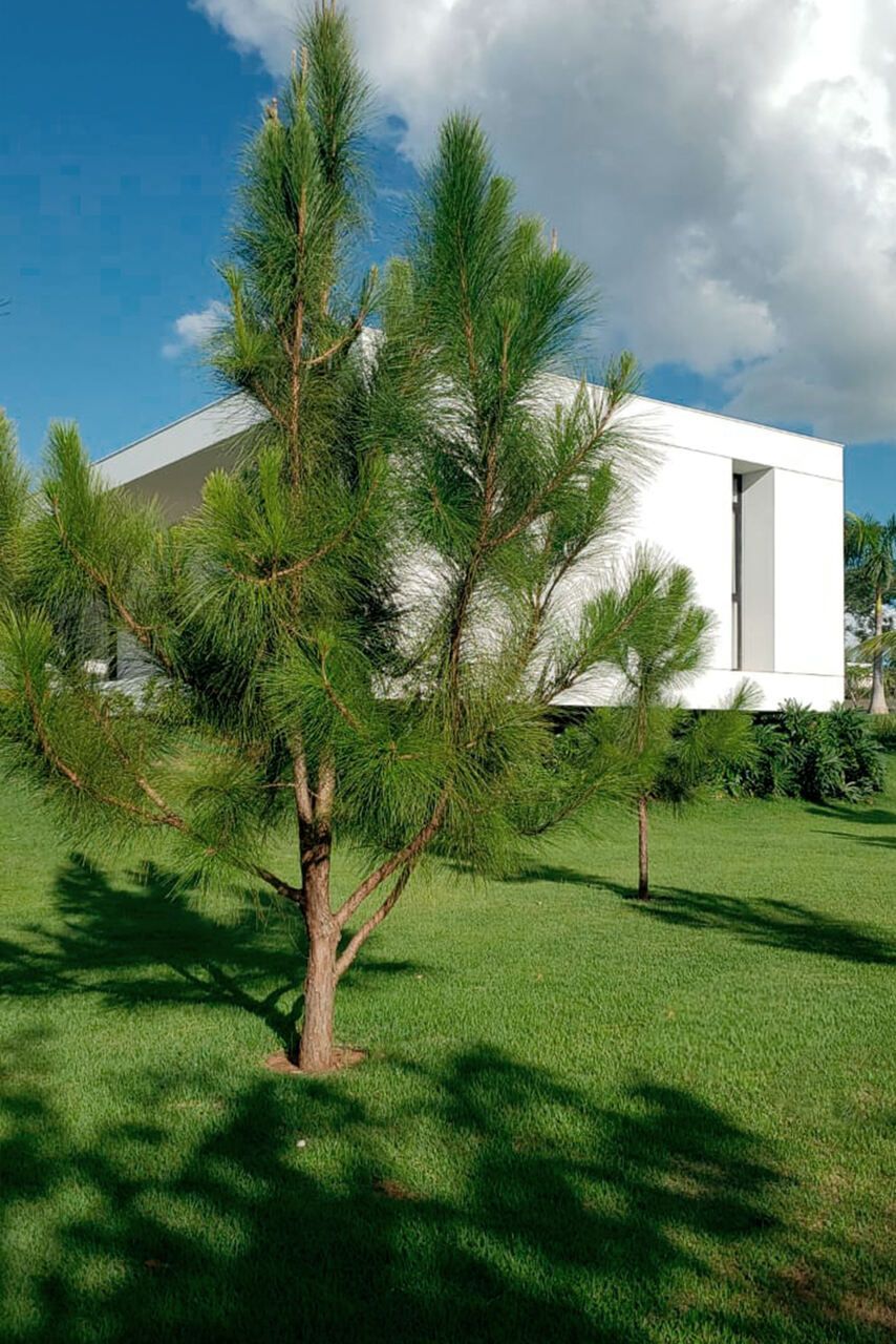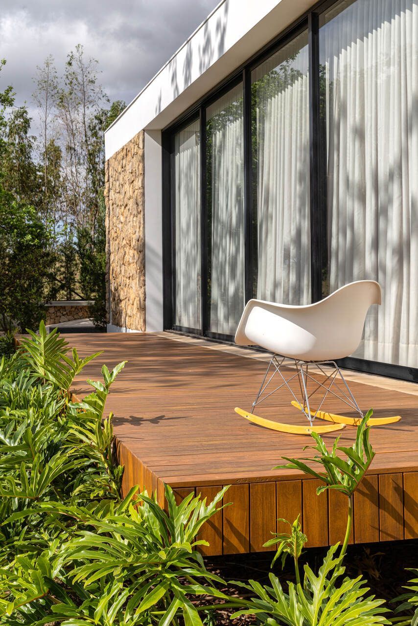 O paisagismo, criado e executado pelo próprio arquiteto, reforça a continuidade entre arquitetura e terreno. O verde se aproxima da casa com naturalidade, contornando os patamares e emoldurando o volume branco. A piscina e o deck funcionam como extensão da sala, enquanto o horizonte permanece sempre presente, acompanhando as variações de luz ao longo do dia.