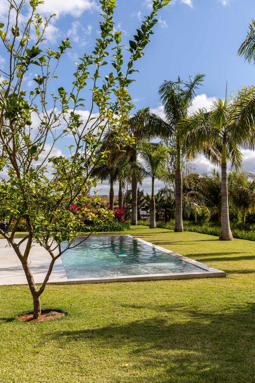 O interior foi setorizado em três campos funcionais bem definidos: área social, íntima e de serviço. Ao atravessar o hall de entrada, à direita surge uma suíte que também funciona como escritório, estabelecendo relação direta com o convívio. A área social integra estar e TV, cozinha gourmet, varandas e o pátio com piscina e deck em uma sequência contínua de espaços. Uma curadoria precisa de mobiliário baixo preserva o campo visual livre de barreiras, ampliando a conexão com o verde e com o céu amplo que se desenha ao redor.