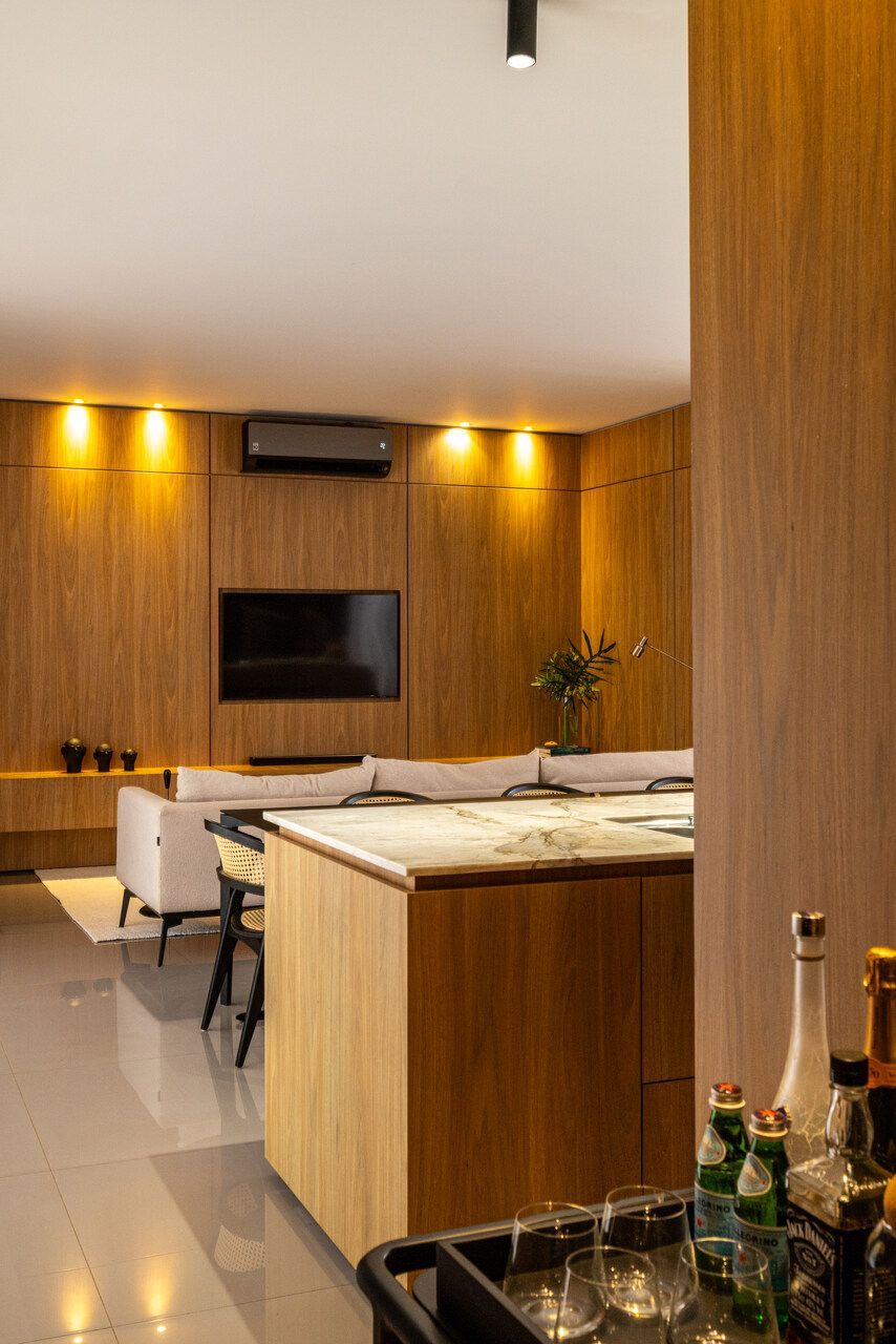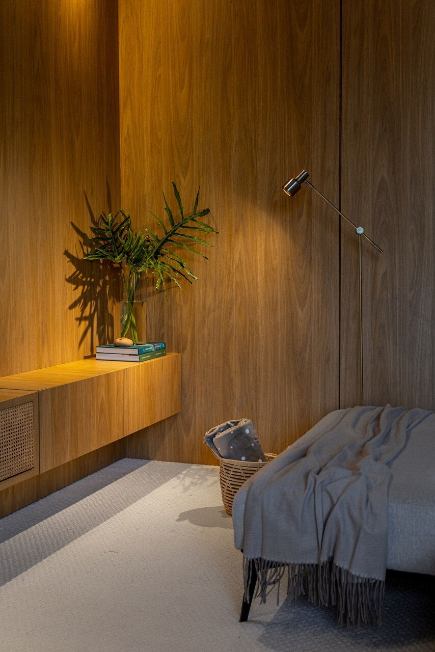 Na ala íntima, a atmosfera se transforma. A suíte master e as duas demi-suítes recebem marcenaria com acabamento em freijó, material que também dialoga com o piso em madeira tauari. O conjunto transmite acolhimento e naturalidade, onde a escolha dos materiais reforça a sensação de conforto. Serviço, despensa e lavanderia completam o programa de forma discreta e funcional, garantindo organização sem interferir na experiência dos espaços principais.