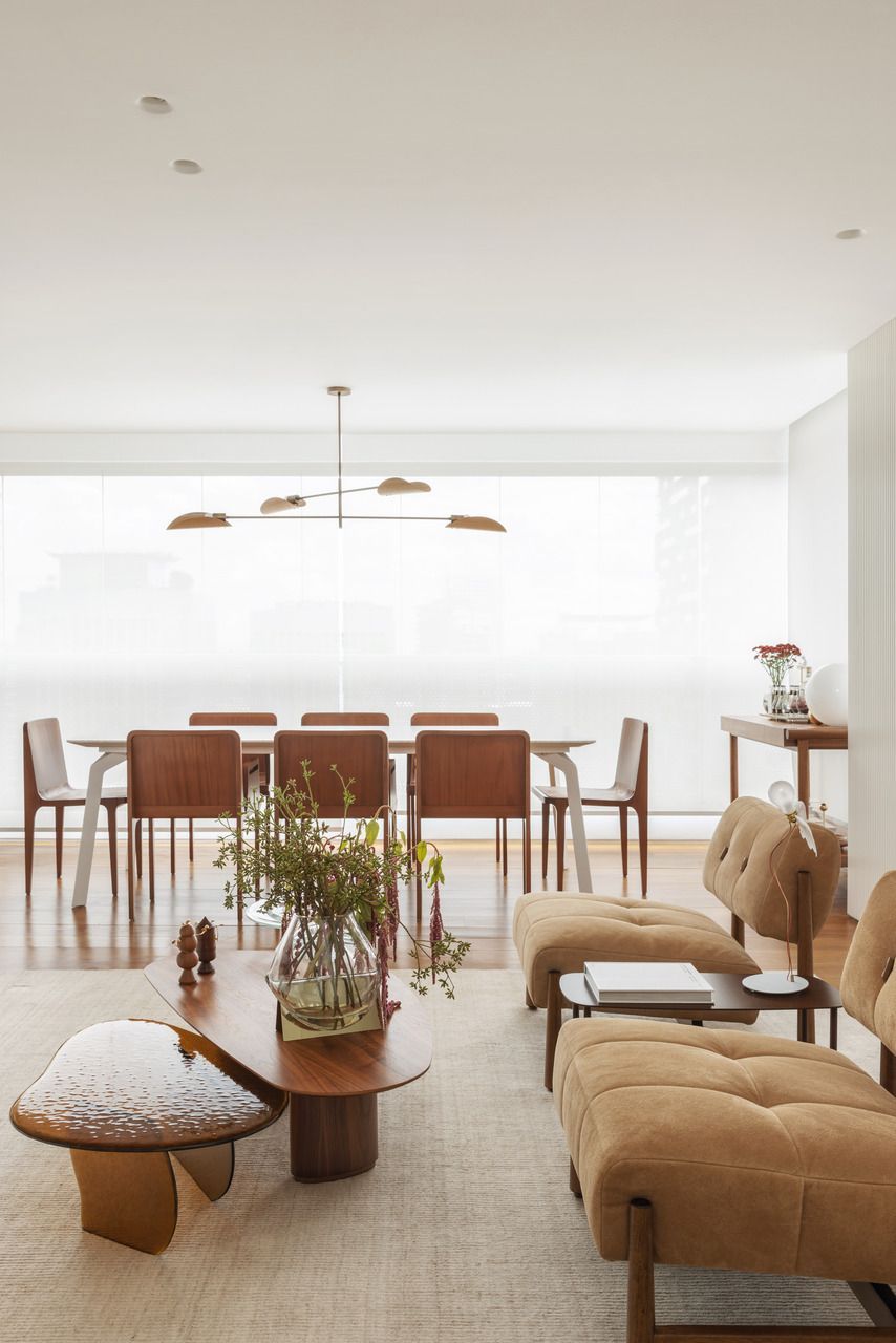O ponto de virada foi a decisão de integrar o terraço ao living e transformar um dos três dormitórios originais em sala íntima. Essa operação, simples apenas em aparência, redefiniu a dinâmica do apartamento: a sala passa a respirar mais, o jantar ganha presença e o percurso cotidiano se torna mais orgânico. Para garantir flexibilidade, portas de correr permitem que cozinha e sala de TV ora se abram totalmente ao estar, ora assumam caráter mais reservado, uma solução perfeita para um casal que desejava ambientes fechados, mas facilmente integráveis quando necessário.