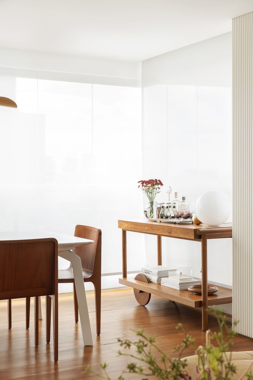 No living, o grande painel ripado em laca off-white introduz a estética minimalista contemporânea que orienta o projeto. A textura discreta das superfícies cria um ritmo visual que acolhe sem pesar. A paleta clara domina, mas é propositalmente equilibrada pela base quente do apartamento: piso de peroba de demolição e marcenarias em carvalho natural, responsáveis por um contraponto essencial.
