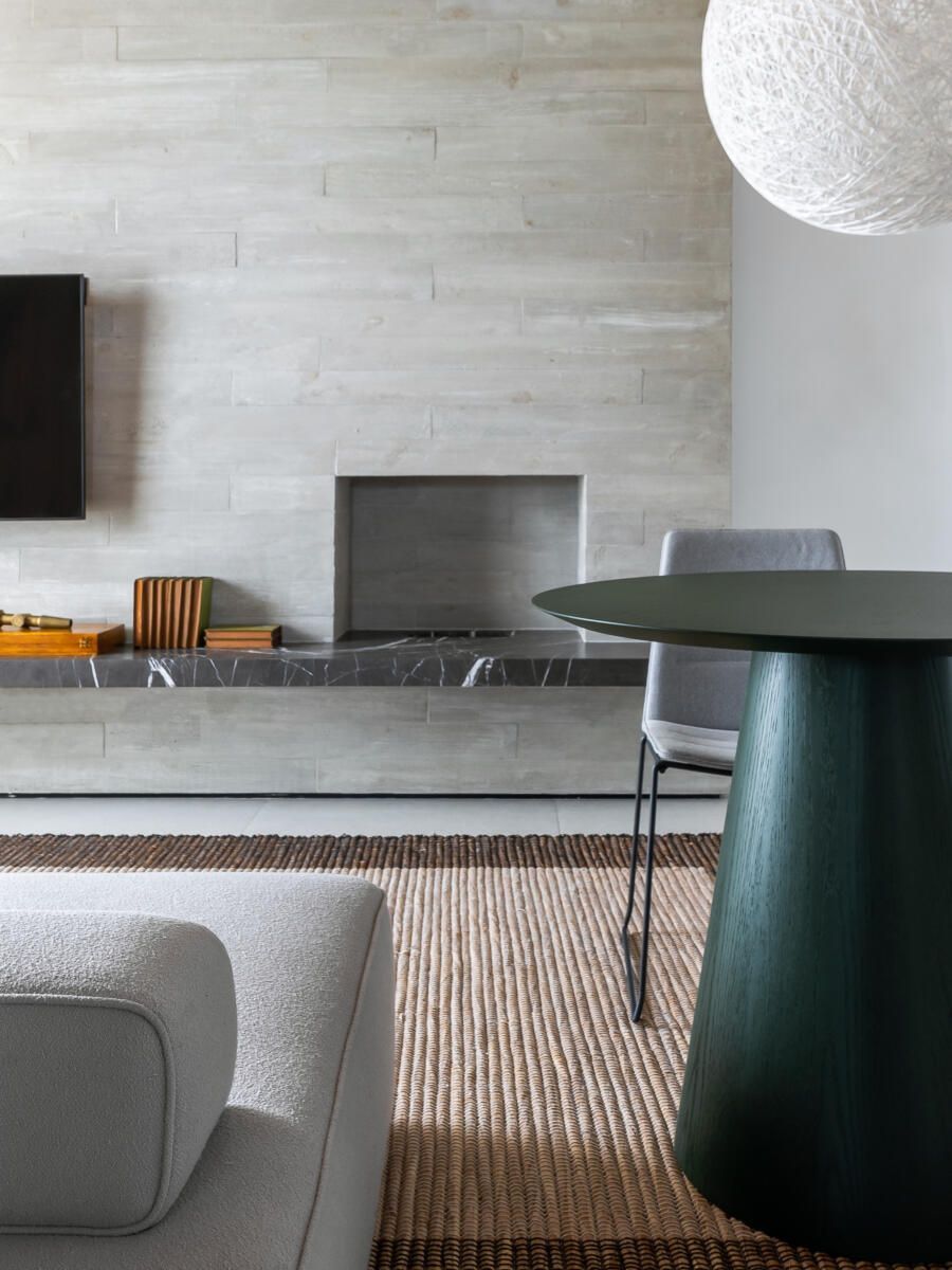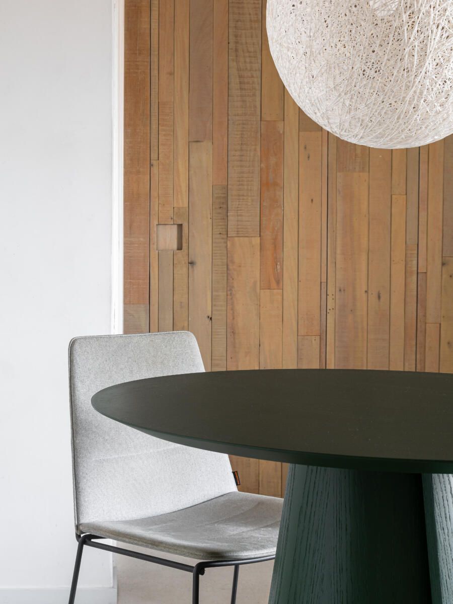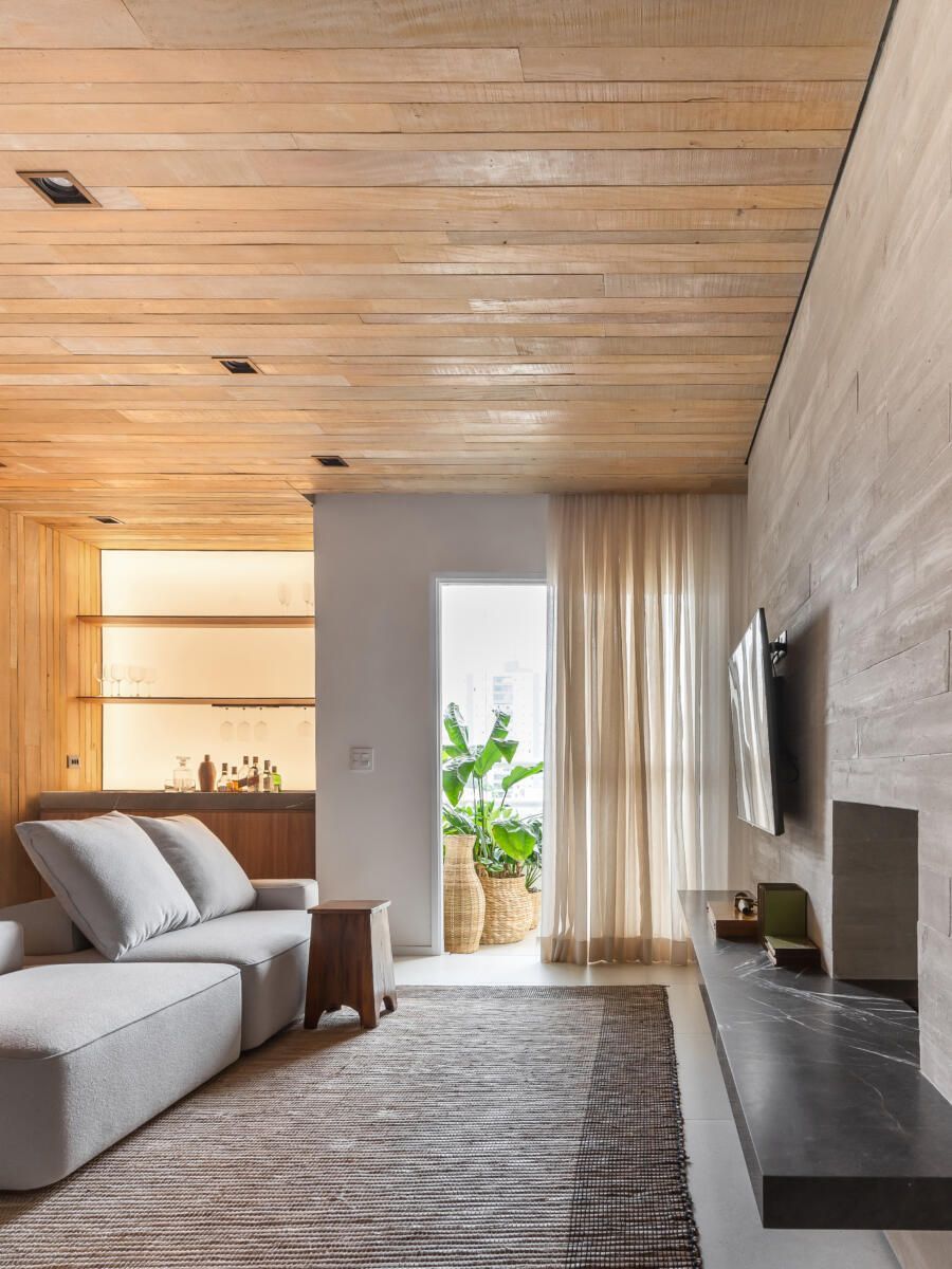 “O apartamento preza por bastante iluminação natural e ventilação vindo da face Sul. A remoção das alvenarias de fechamentos contribuíram para dissipação da luz natural e do fluxo de ar. Por ser um apartamento com divisa para vários vizinhos, optamos por trabalhar com materiais que possuíssem maior absorção acústica e conforto térmico, tendo em vista que o apartamento não possui ar condicionado.”