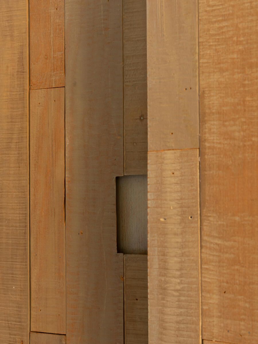 “O layout deste apartamento foi fragmentado em uma série de elementos/volumes separados. A reimaginação arquitetônica do espaço começou com a ideia de reduzir tudo a um estado de vazio e determinar as volumetrias para moldar os espaços. Um volume de madeira independente inserido no núcleo da planta baixa abriga os dormitórios e também se torna o meio para ordenar silenciosamente todos os outros elementos do programa.”
