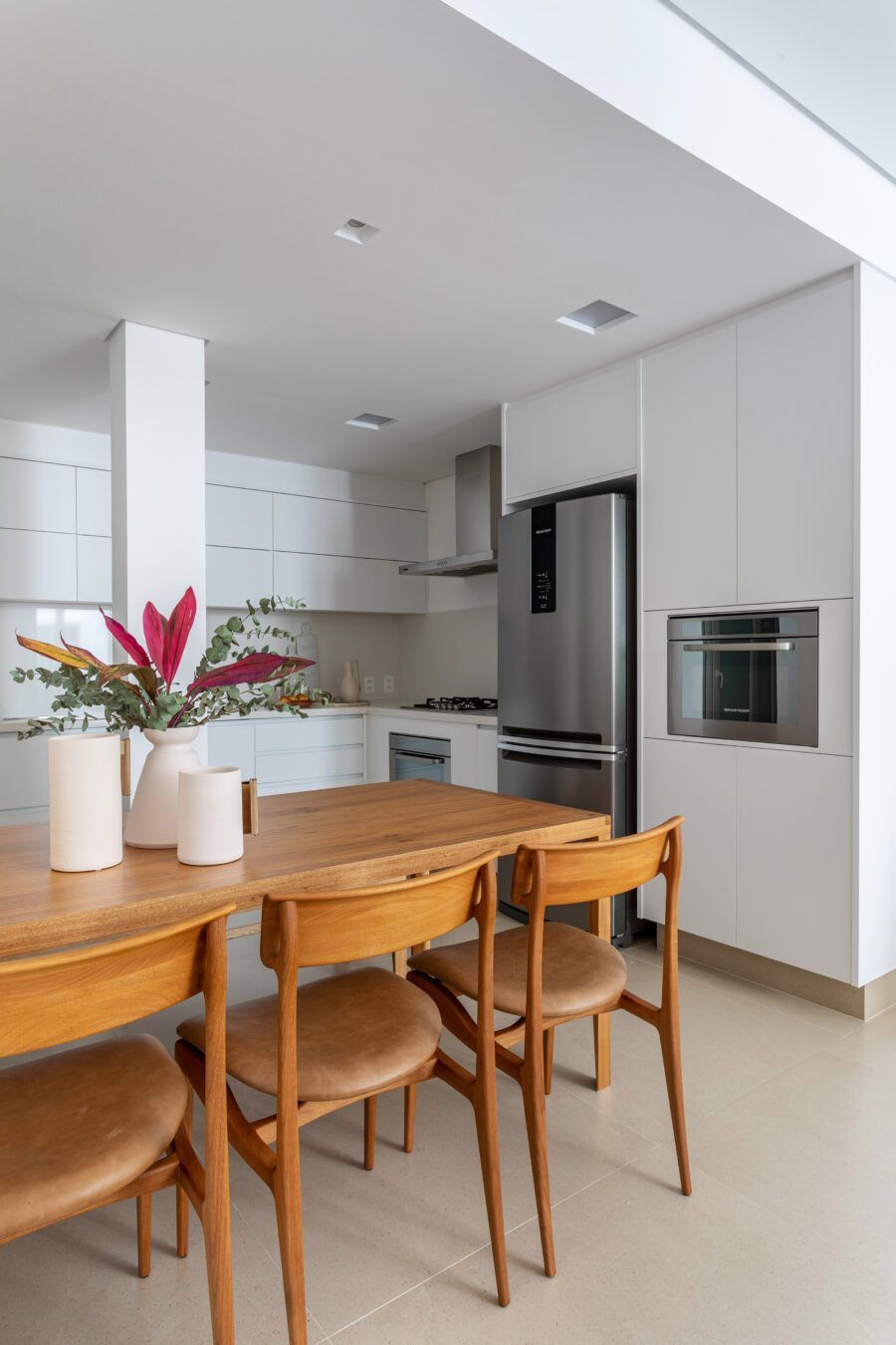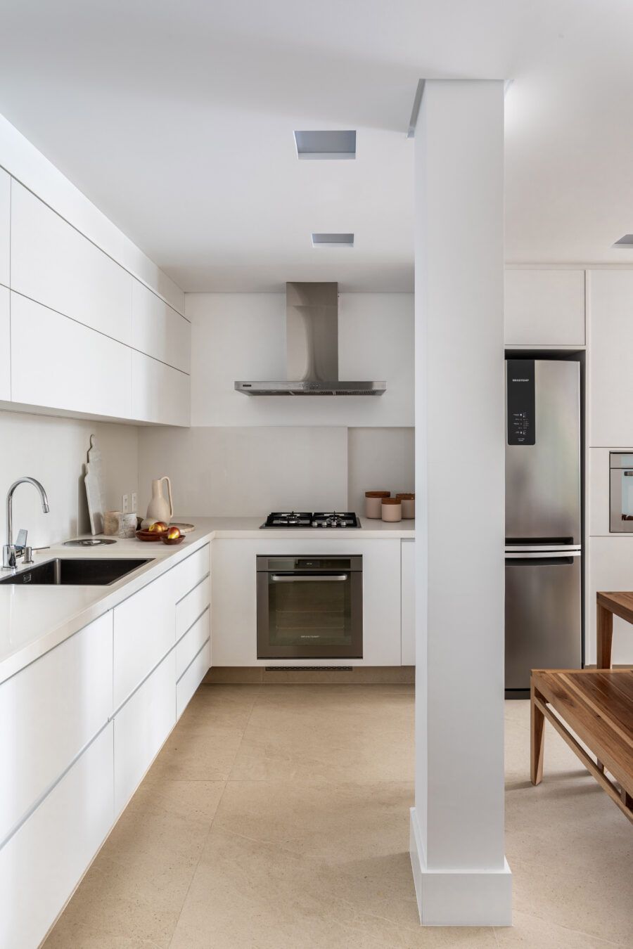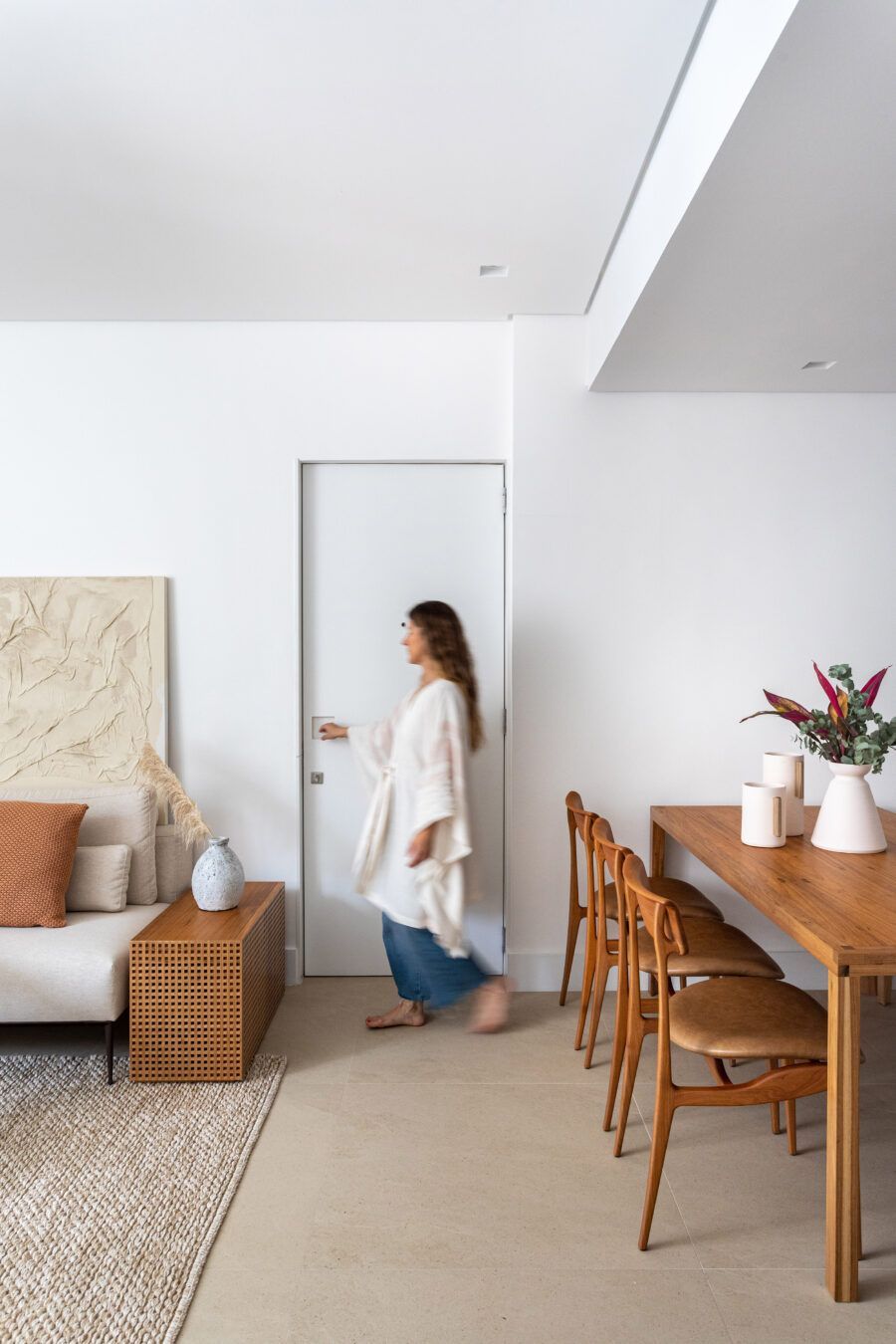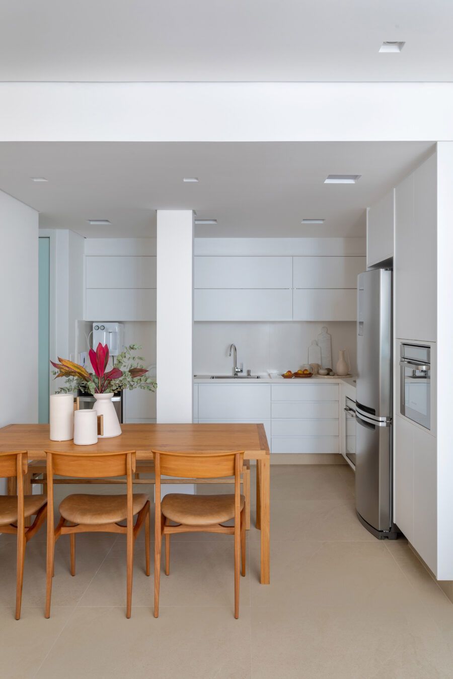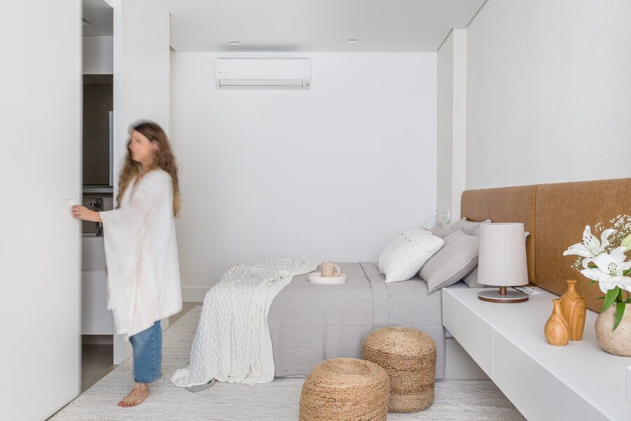 Na decoração, peças simples e atemporais reforçam o conceito minimalista, com presença de bastante iluminação natural. O destaque vai para móveis brasileiros de design assinado como a mesa Caetano e o banco Helena, ambos de Aristeu Pires, e o banco Angela, de Fernando Mendes. Já na marcenaria, a porta de correr que dá acesso ao banheiro da suíte e vai do piso ao teto, camuflada no painel de marcenaria branca que reveste a parede em frente a cama, completa o projeto.